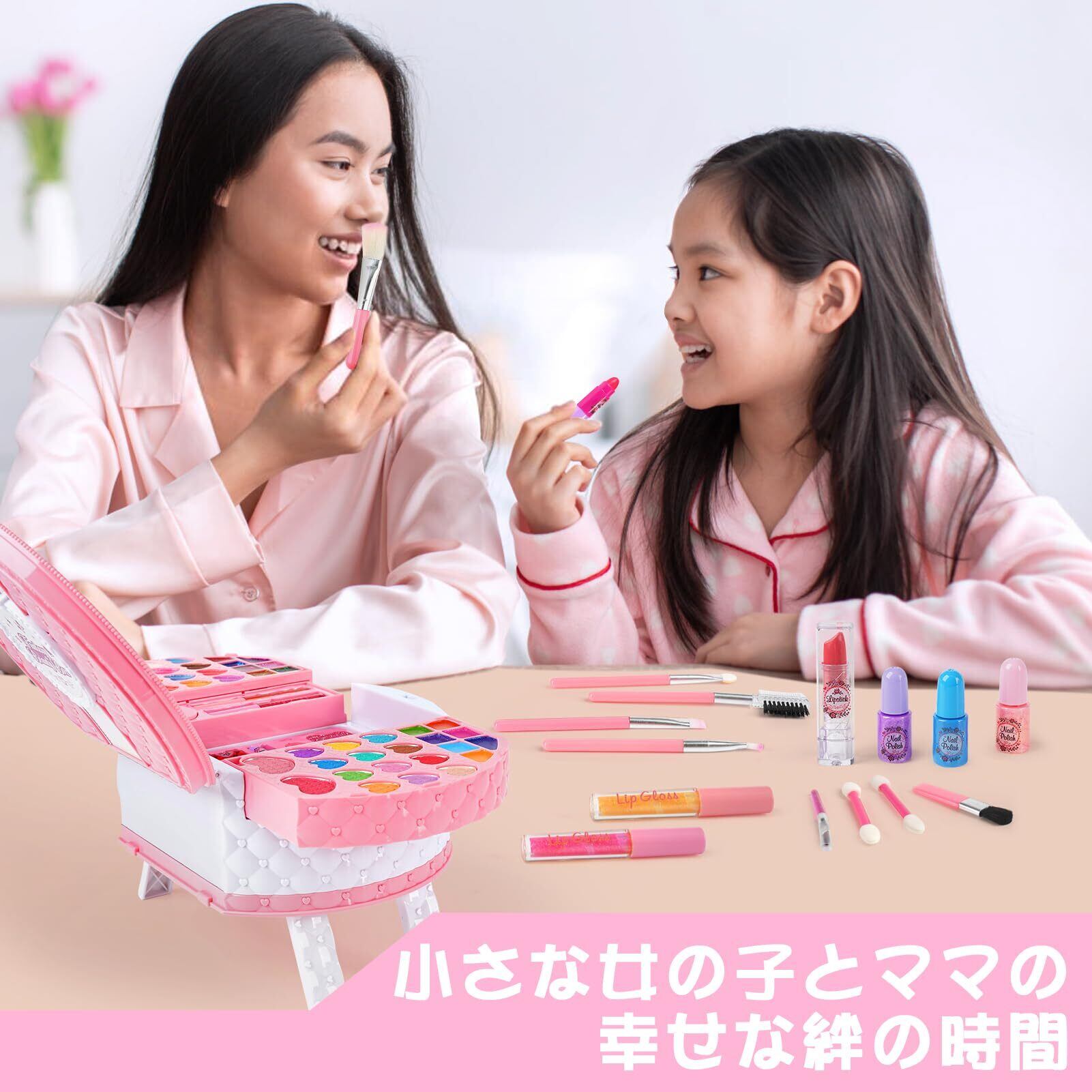 このメイクセットは、小さなお子様が遊ぶことを考慮した安全設計になっています。優しい素材で作られているため、安心して楽しく遊ぶことができます。親子で一緒にメイクを楽しむことで、より絆を深める素敵な時間を過ごせます。