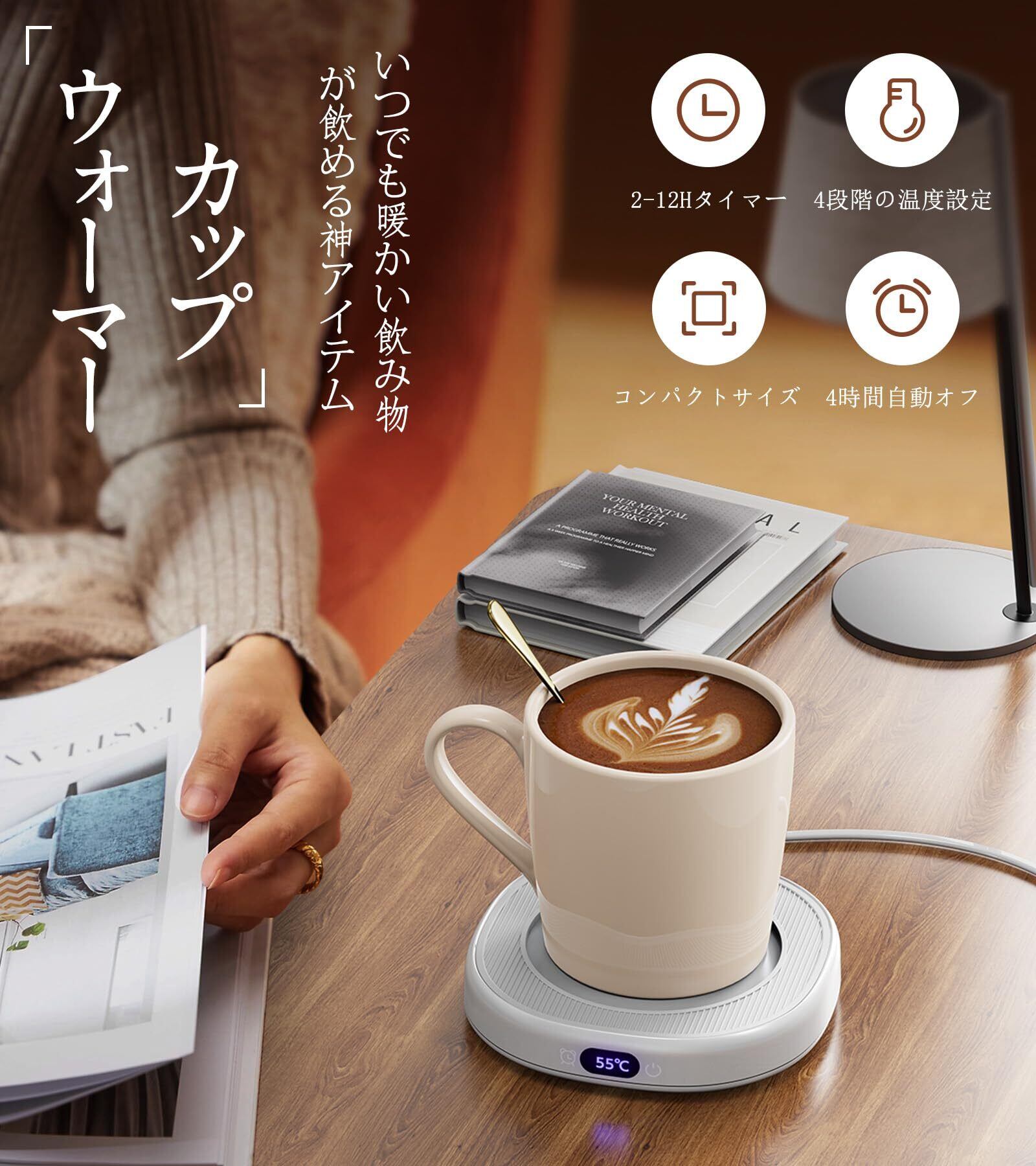 カップウォーマー 【コンパクトでも、大小カップに自在対応】 コーヒーウォーマー 4段階温度(45℃-75℃) 保温コースター 2-12Hタイマー 静音 ドリンクウォーマー 急速加熱 コーヒー/お茶/水など飲み物 マグウォーマー フードウォーマー 4時間自動オフ オフィス/家庭用 誕生日/クリスマス プレゼント PSE安全認証済み AC100V,50/60Hz全国対応 (ホワイト)