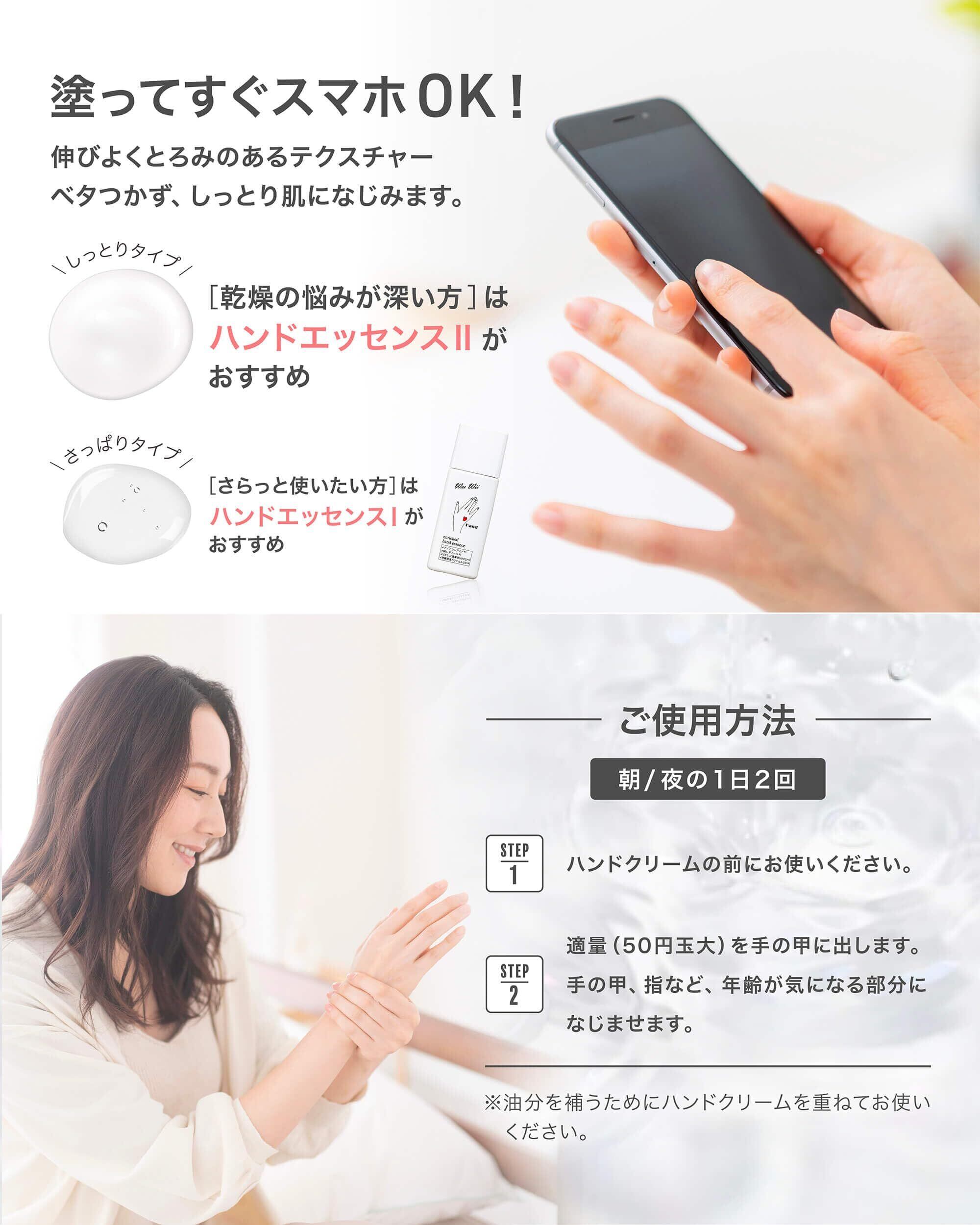 【毎日使える】クリームではない、めずらしい手の美容液タイプ。軽やかなハンドケアができます。手の甲にのせたとき、たれてしまわない程度のほどよいとろみ。さらっとした使いここちで、ベタつかないことが特徴。塗ったあとすぐにスマホ操作ができます。