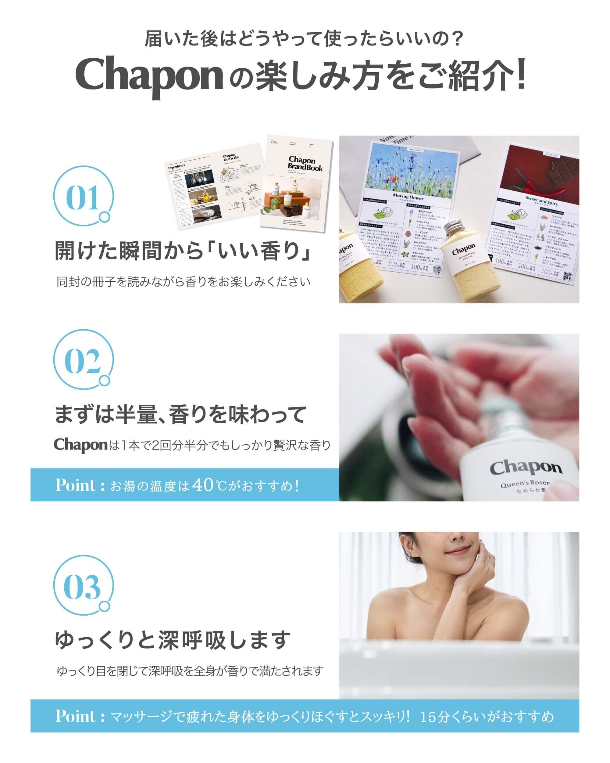 ■【アロマ専門家が生み出す、Chapon独自の高級な香り】最大5種類の天然アロマを贅沢に配合。人工香料は一切使わず、貴重なエッセンシャルオイルのみを100%配合することで、今まで自宅では味わうことができなかった高級エステのような贅沢な香りの入浴体験を実現しました。 ■【保湿ケアもできるのでスキン&ボディケアにも】3つの厳選された美容成分「ミネラル、ホホバオイル、重炭酸」をしっかり配合。ミネラルによる温熱効果の向上、ホホバオイルでお肌をしっかり保湿、重炭酸でお肌を清浄に保つ効果が期待できます。