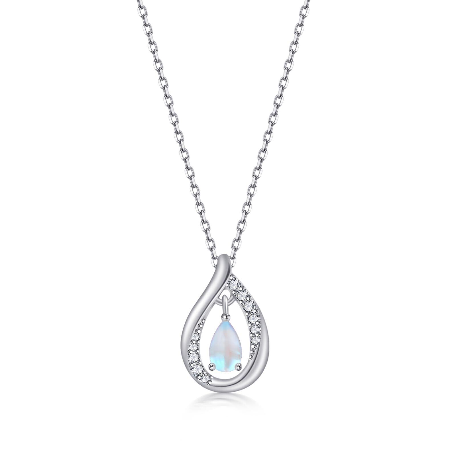 ゆらめく雫デザイン:なめらかなシルバーペンダントに幻想的なムーンストーンをあしらった、洗練された水滴モチーフのネックレス。動きに合わせてさりげなく揺れ、フェミニンなコーデにもカジュアルな装いにも似合う、万能なアクセサリーです