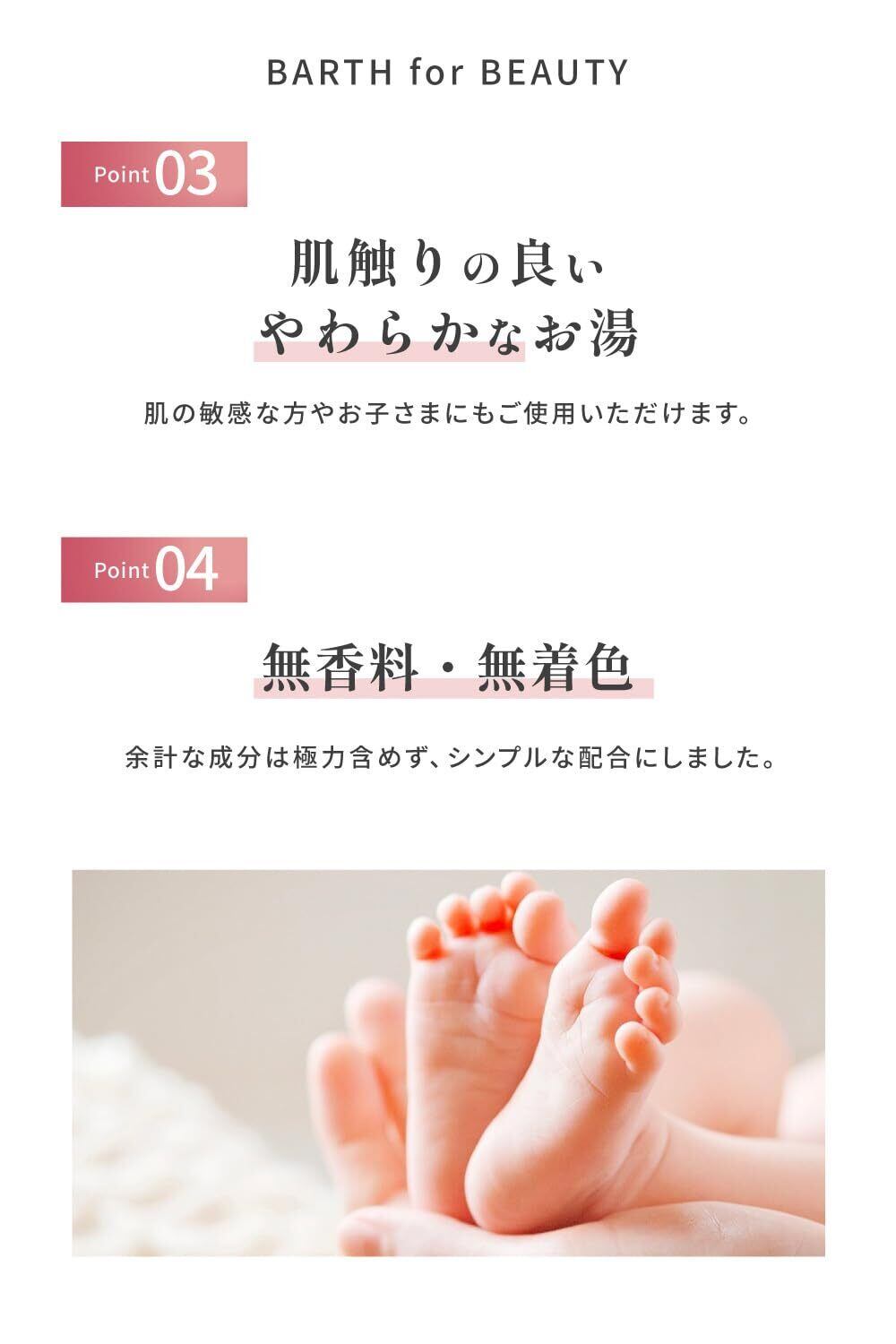商品特長 【洗髪や洗顔にも】BARTH中性重炭酸入浴料BEAUTYは余計な成分を極力含めない無香料・無着色のシンプルな配合で、お湯は洗髪や洗顔にもお使いいただけます *保湿剤