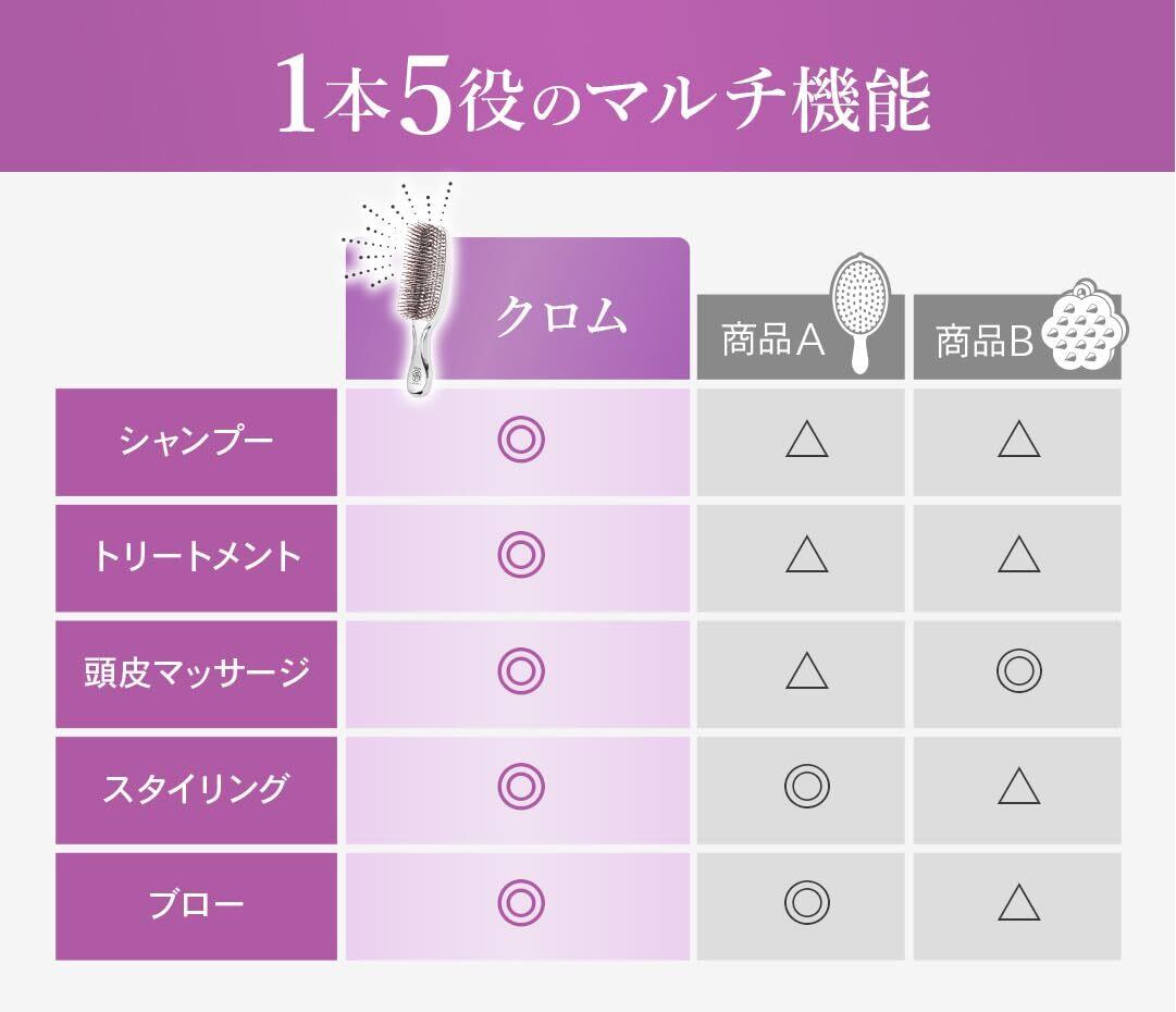 商品特長 ブラシ部分に静電気がとどまらないクロムメッキ加工と、静電防止剤を練りこんだピン植毛により、静電気防止に特化。376個の先玉ピンと段差植毛、頭皮密着設計で毛穴の汚れを除去します。