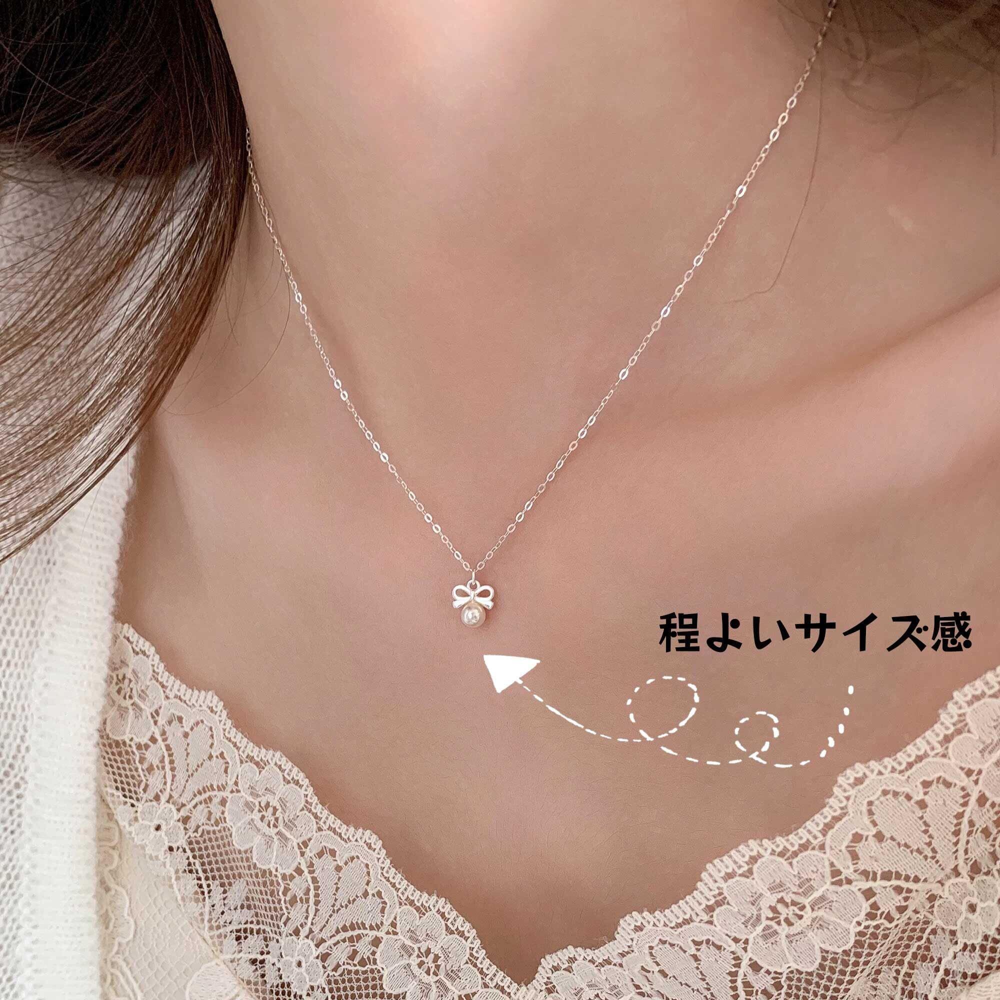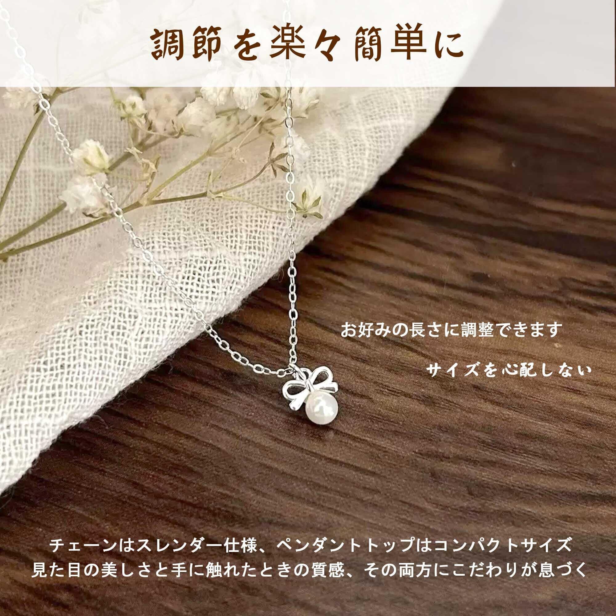 【人気のデザイン】:ネックレス全体はシンプルなスタイルを採用し、ペンダント部分は優雅な真珠と上品なリボンの調和が、女性らしいしなやかな美しさを引き立て、とにかくコンパクトで小ぶりなサイズが特徴。主張しすぎない控えめな存在感で、派手になりすぎずにさりげなくあなたの魅力を引き立てます。普段のカジュアルから特別な日のドレスアップまで、多様なスタイルに自然に溶け込みます。どんなシーンでもさりげなくおしゃれを引き立て、個性を優しく強調してくれます。ネックレス最大長さ440mm(長さを 55mm 調節可能)、チェーン太さ1.0mm