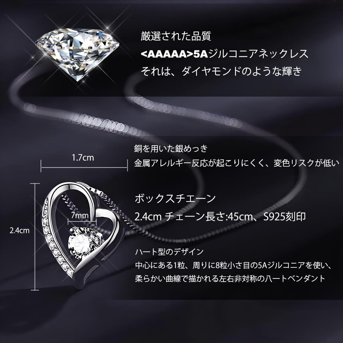 ネックレスのデザイン·金属アレルギーフリーシルバー925チェーン:45cm ペンダントサイズ:(縦)約2.4cmx(横)約1.7cm、中石直径:約7.0mm。中心にある1粒、周りに8粒小さ目の5Aジルコン を使い、柔らかい曲線で描かれる左右非対称のハートペンダントを採用します。どんな年齢に合わせたハート型デザインを採用し、可愛くてファッション。完璧なネックレスをするために、シルバー925銀で多層メッキ加工を施しましたの光沢が高く、体に優しくてアレルギー反応が起こりにくく、金属アレルギーの方や敏感肌の方でも安心してご利用をいただけます。