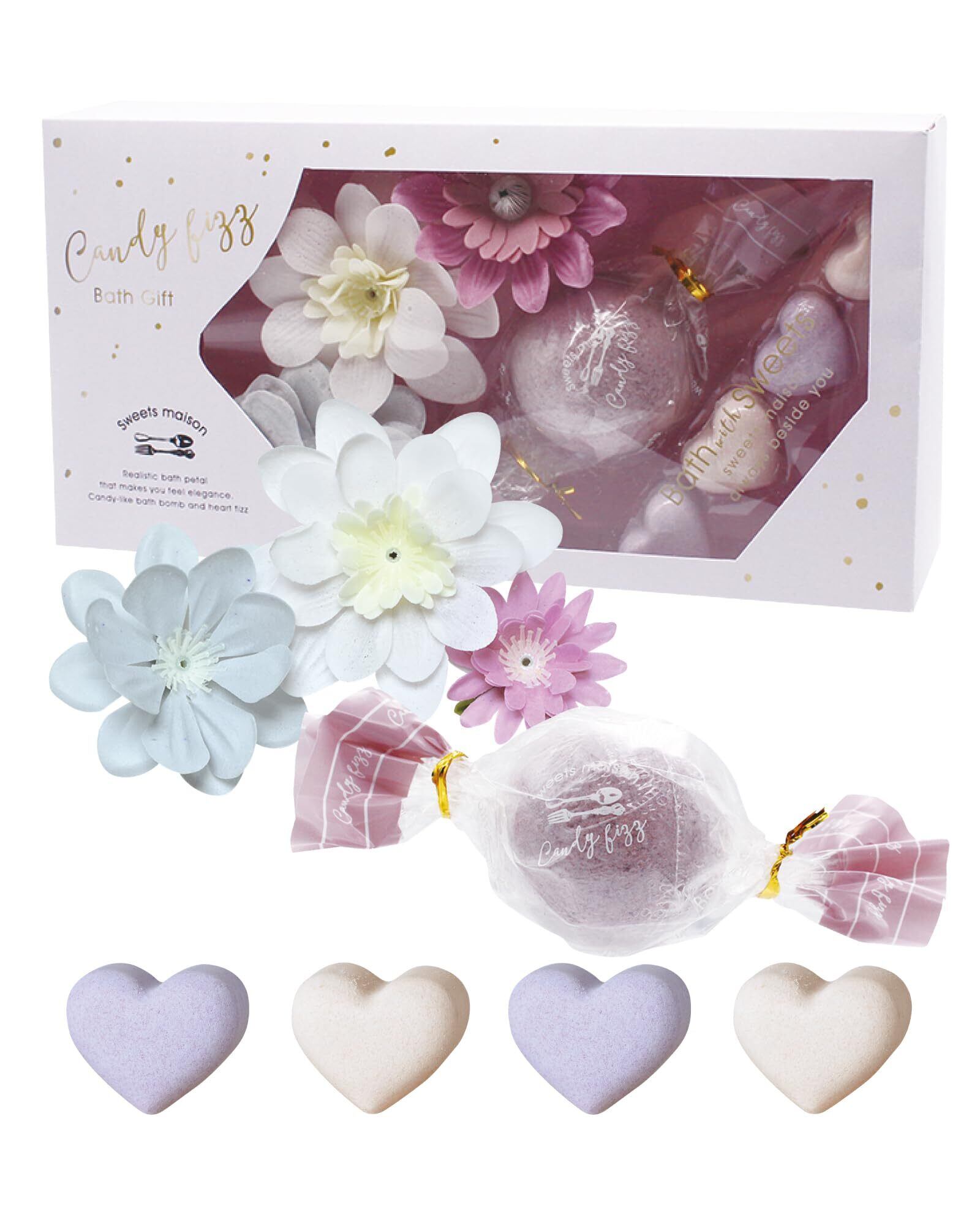 キャンディ型のフィズ、フラワーペタル、ハート型のフィズが入った豪華な入浴剤ギフト