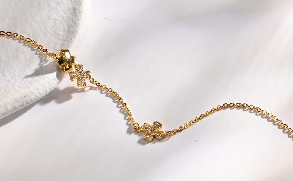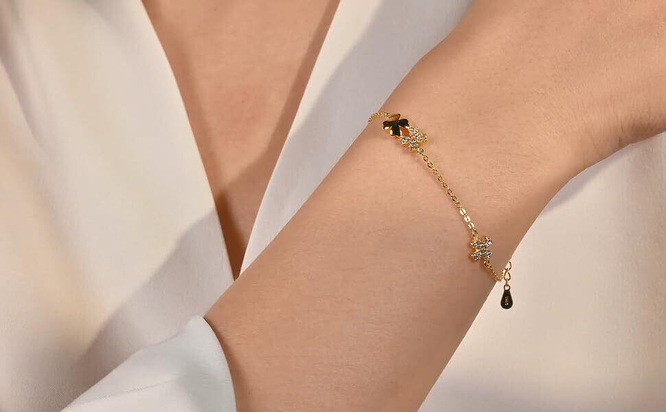 幸運を身につけて:キラキラと輝くジルコニアがあしらわれた四つ葉のクローバーが、手元にさりげなく幸運を運んでくれるブレスレット。願いや思いを込めて、毎日に寄り添うアクセサリーです