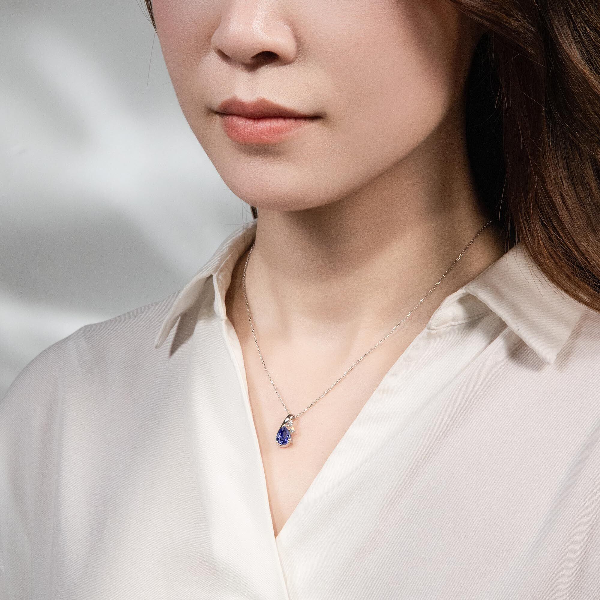 繊細な光の造形:梨形にカットされたタンザナイトは、光の角度で繊細な輝きを奏でます。2粒の白いジルコンが両脇を優しく包み、立体感のある美しさを創出。首元でそっと揺れるその姿は、洗練された上品さを添え