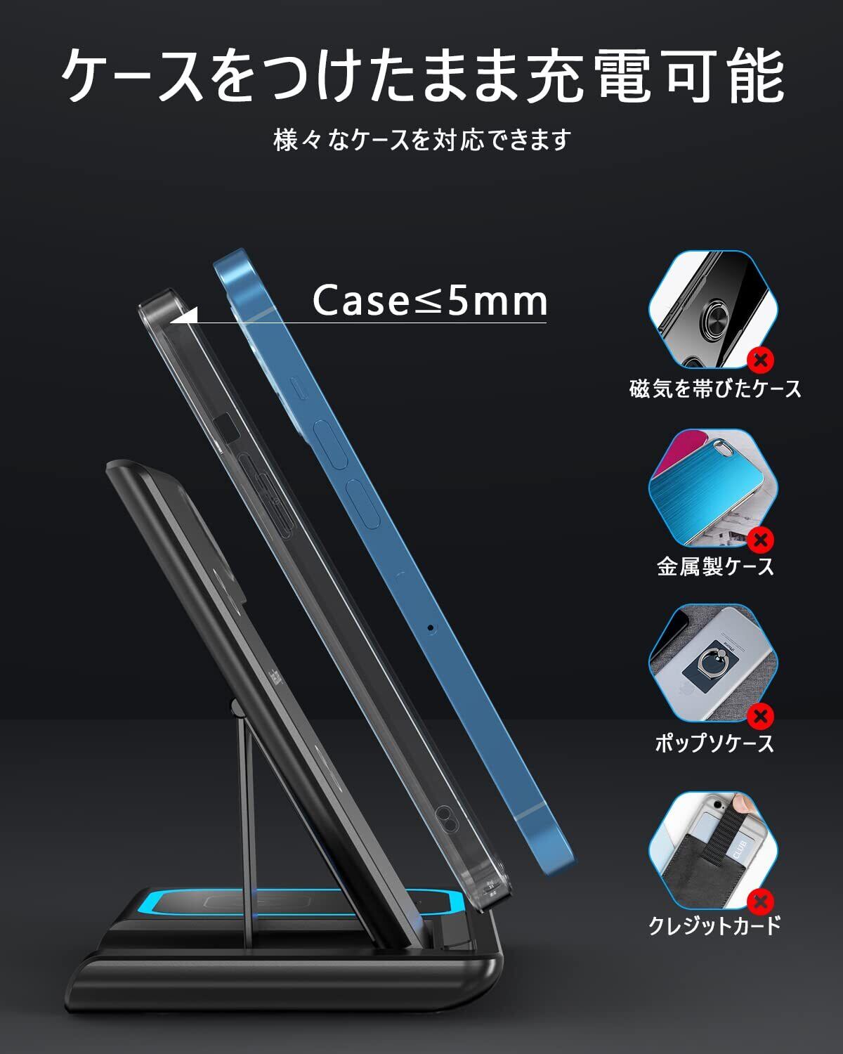【ケースをつけるまま】1サイズ大きいPro MaxやPlusでも楽に乗せられます、ほとんどのスマホケースを付けるままに置くだけでスマートフォンを充電することが可能です。(※5mm以下の厚みの場合に限ります。また金属製や磁気を帯びたケースおよびクレジットカードは、充電前に取り外してください)。
