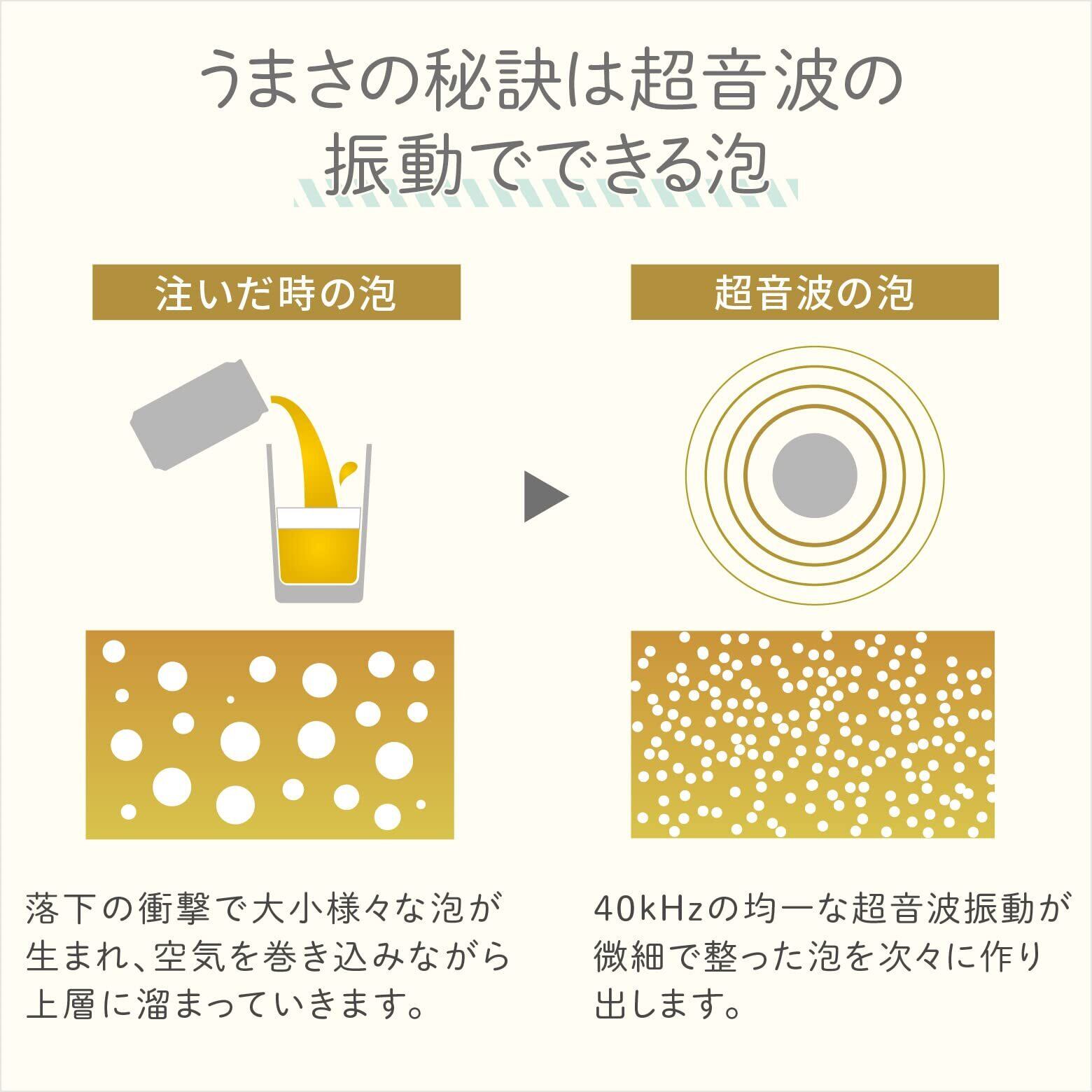 1秒間に4万回の超音波が生み出すきめ細かいクリーミーな泡で、いつもの缶ビビールの泡はうまさを守る"フタ"。泡は大きさによって性質が異なり、大きな泡はすぐに弾けてしまいますが、きめ細かい泡は長持ちしてクリーミーな感触をもたらします。ールをお店で飲むような極上の味わいをご家庭でお楽しみいただけます。