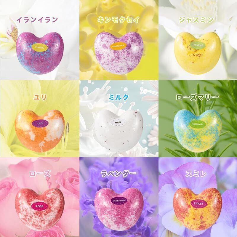 【甘いな香り】このバスボム 9個セットはユリ、キンモクセイ、ローズ、ローズマリー、ジャスミン、ミルク、ラベンダー、イランイランとスミレ9種類の香りがあります。素晴らしい香りの間に、仕事の悩みを忘れましょう!