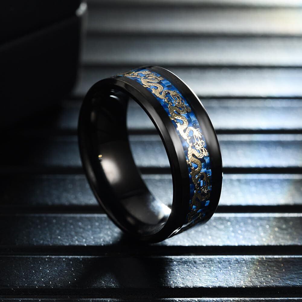 [Rockyu] 指輪 メンズ おしゃれ お守り 龍紋リング 竜紋 耐久性 高級 炭素繊維 カーボンファイバー 平打ち指輪 ステンレス 金属アレルギー対応 色落ちなし 愛の証 幸せの鍵 ファッション アクセサリー