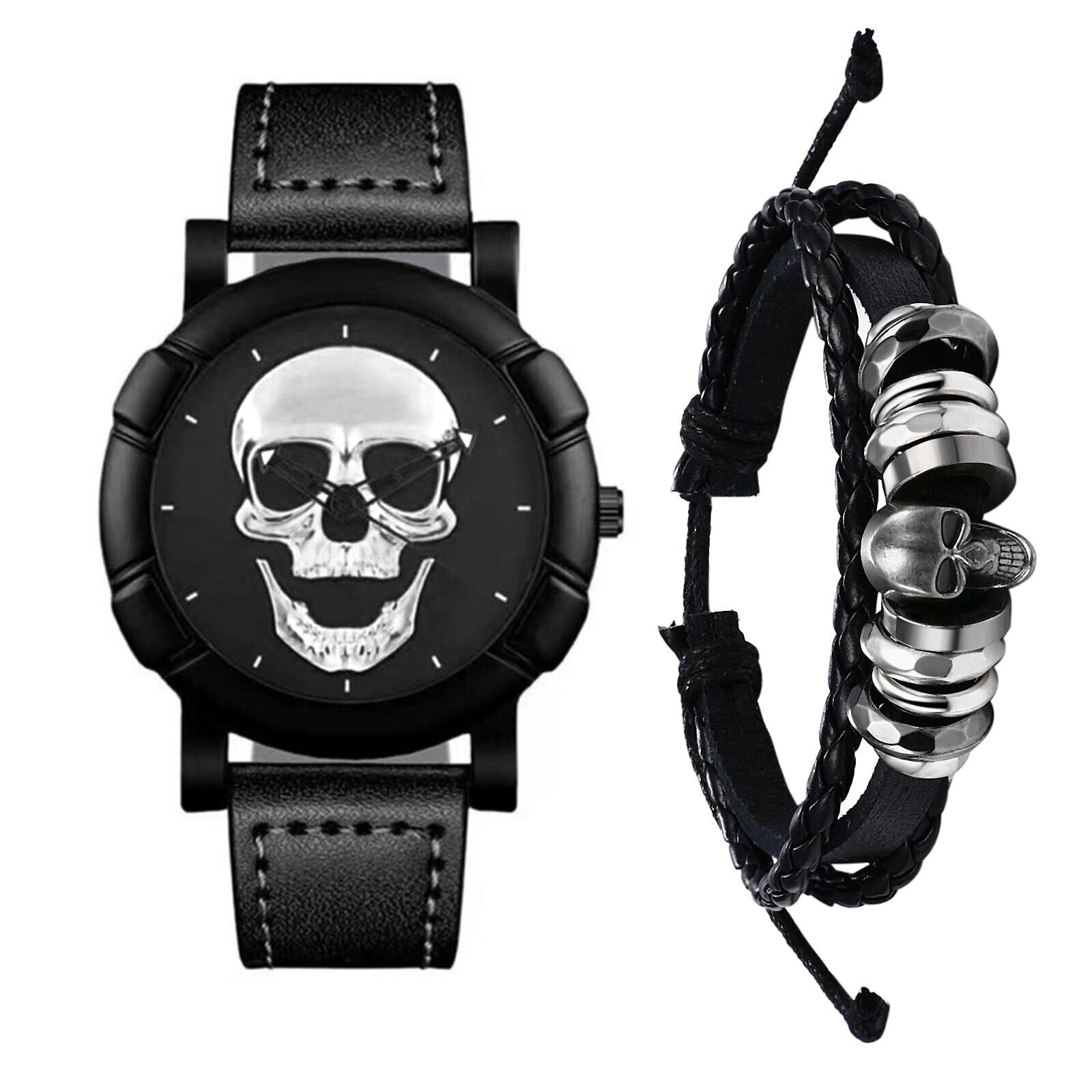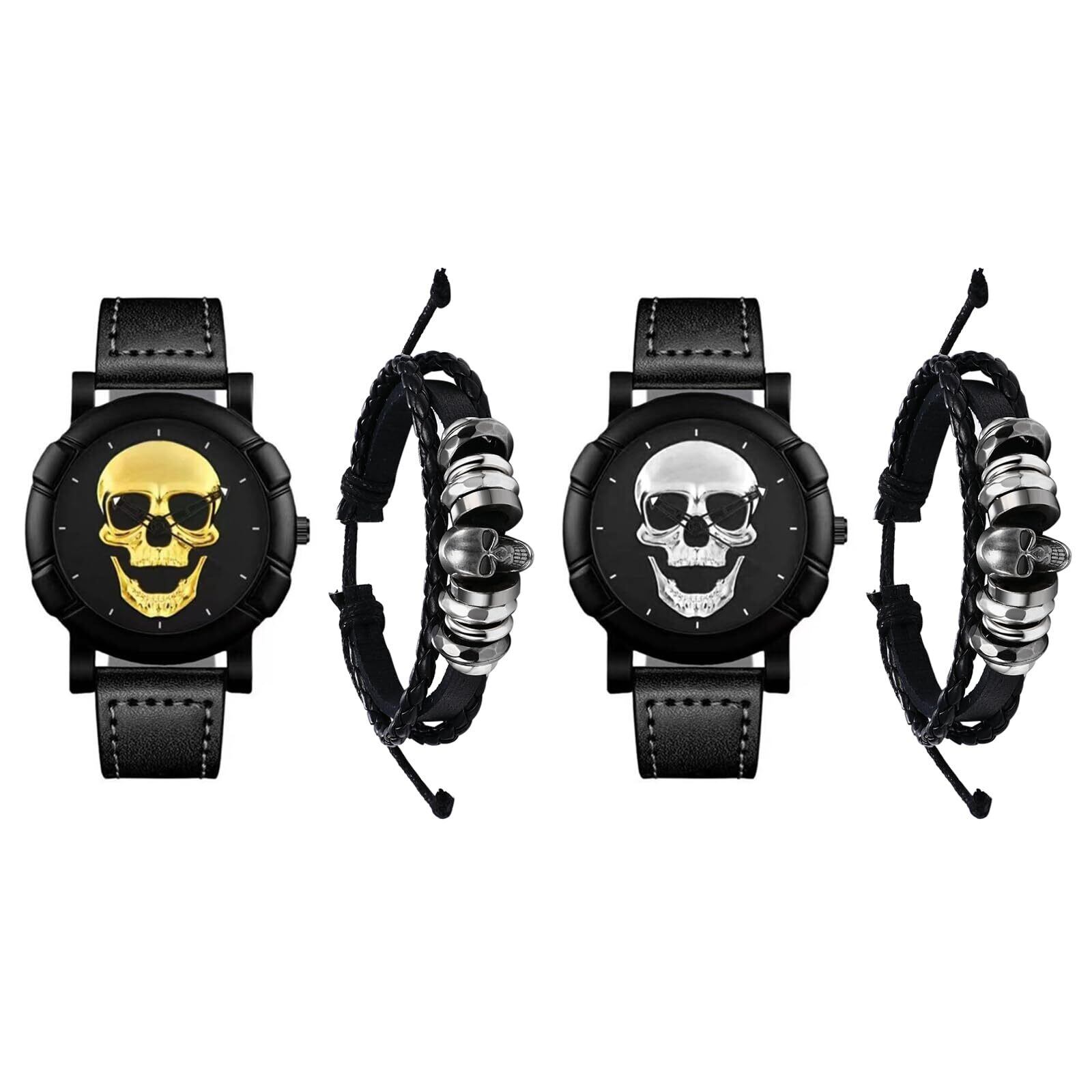 ドクロ バングル メンズ腕時計 セイコー 2点セット: スカル アクセサリー 腕時計 蒸気時代 男性 パンク 時計 円盤 ウォッチ 生活防水 手巻き レザー 腕輪 革 パーティー ハロウィン クリスマス 彼氏 プレゼント シルバー