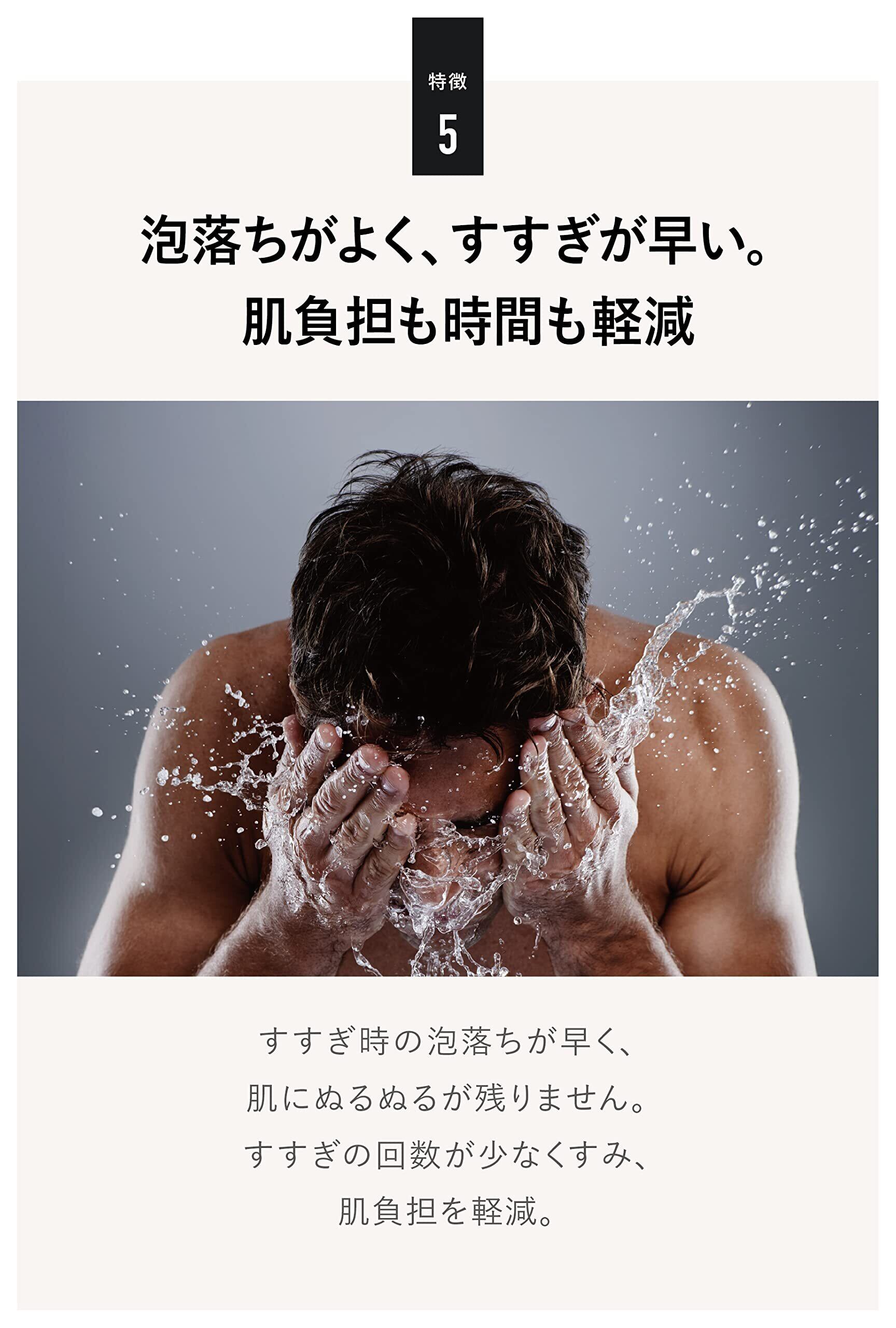 デリケートな肌を考えた保湿成分を配合しており、洗い上がりはしっとりと潤いを残します。肌がつっぱることなく、毎日の洗顔タイムを快適に。男性特有の肌悩みを軽減し、しっかりとケアしてくれる心強いアイテムです。