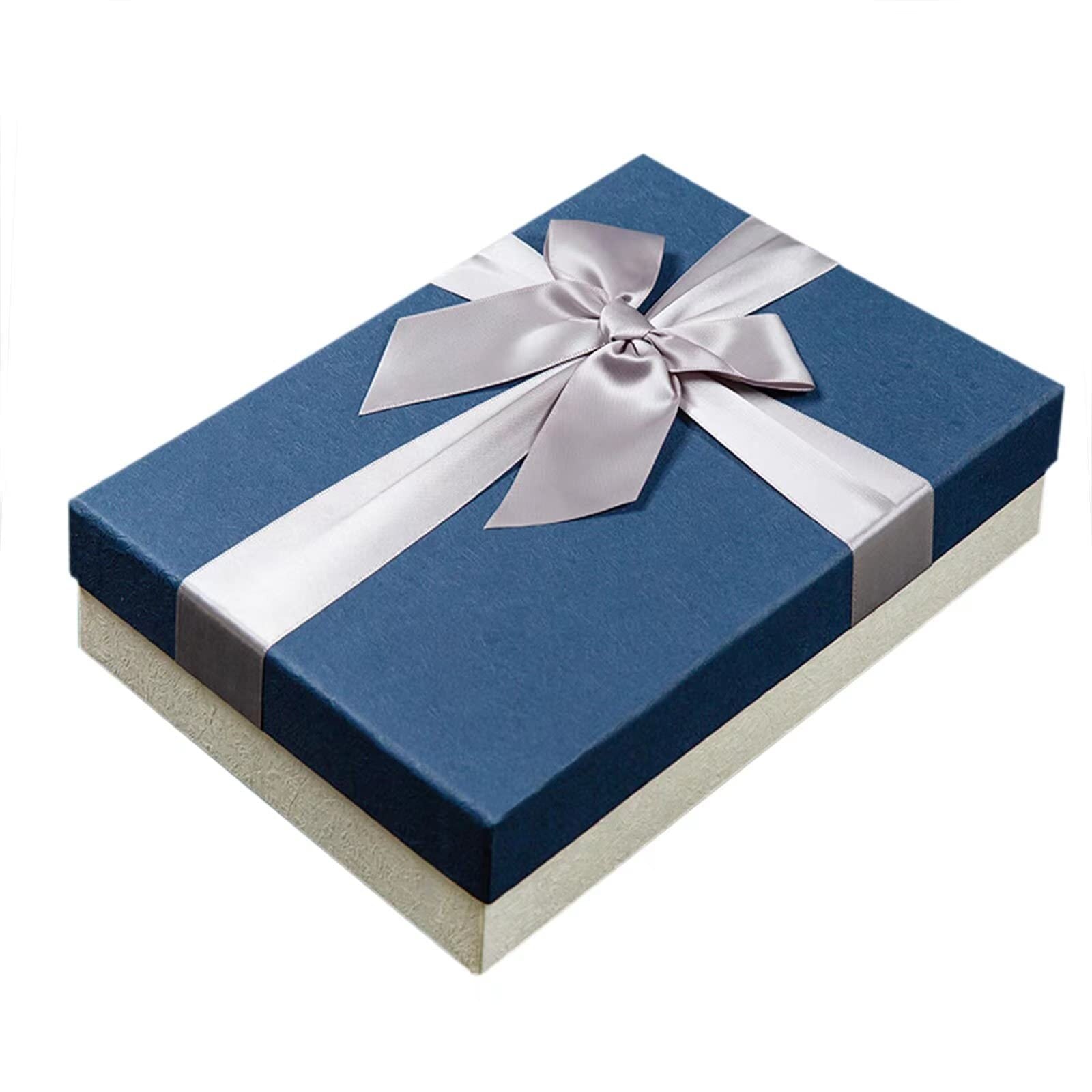 【 青×アイボリーの高級感 】 高級感のある落ち着いたデザインのギフトボックス。大きなリボンが目を引く、お洒落なギフトボックスを大切な方への贈り物にぜひご利用ください。本、洋服、財布、傘にぴったりの11x11x4.1インチのギフトボックス。