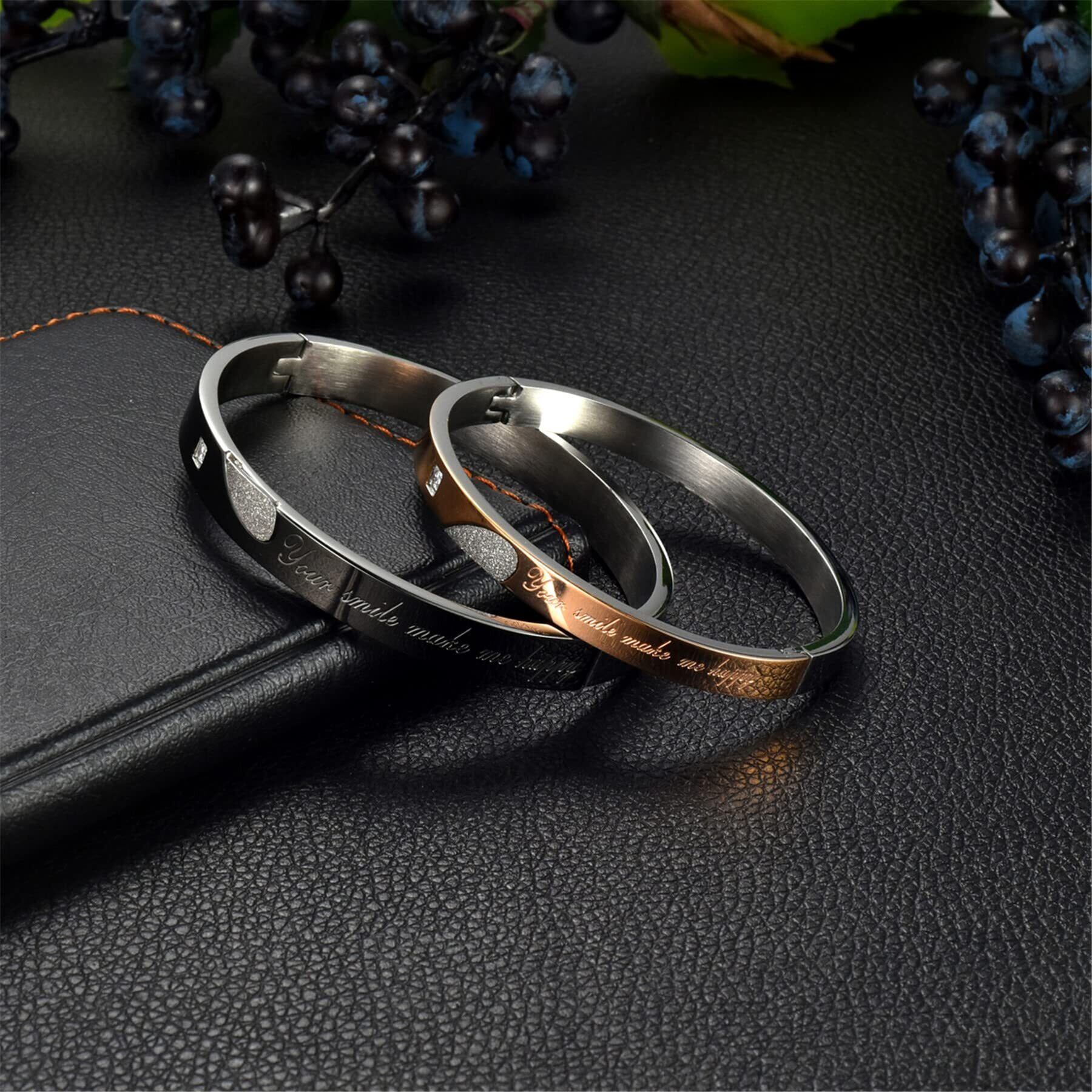 [Flongo] 恋人バングルセット “your smile make me happy” ペア腕飾り カップルブレスレット ジルコン嵌め ステンレス ハートモチーフ 二点セット バレンタイデー 記念日 誕生日 告白 プレゼント ギフト袋付き(ピンクゴールド・ブラック)