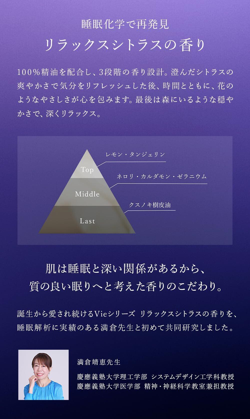 心地よいリラックスシトラスの香りが、使用中のあなたを癒しの世界に誘います。毎日のスキンケア時に、感受性の高い大人の肌に心と体の安らぎを提供します。