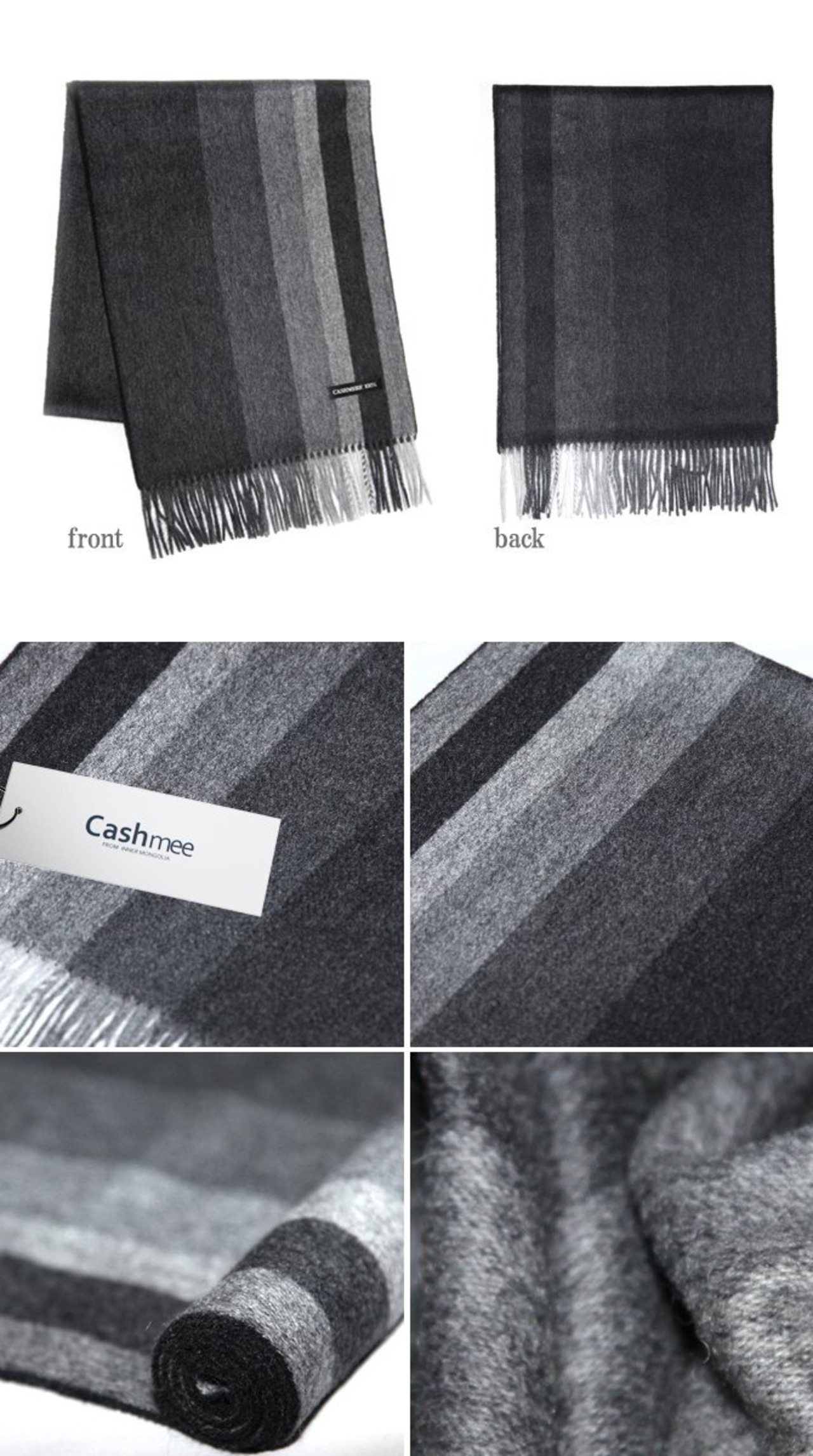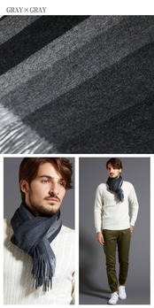 表はグラデーションに染めたボーダー柄、裏面は無地の組み合わせで多様に使えます。 ユニセックスで通勤時のスーツスタイルやカジュアルスタイルでも対応できる非常に使い勝手の良いデザインです。 また、贅沢にもカシミヤ100%のリバーシブル素材なので両面で使えます。