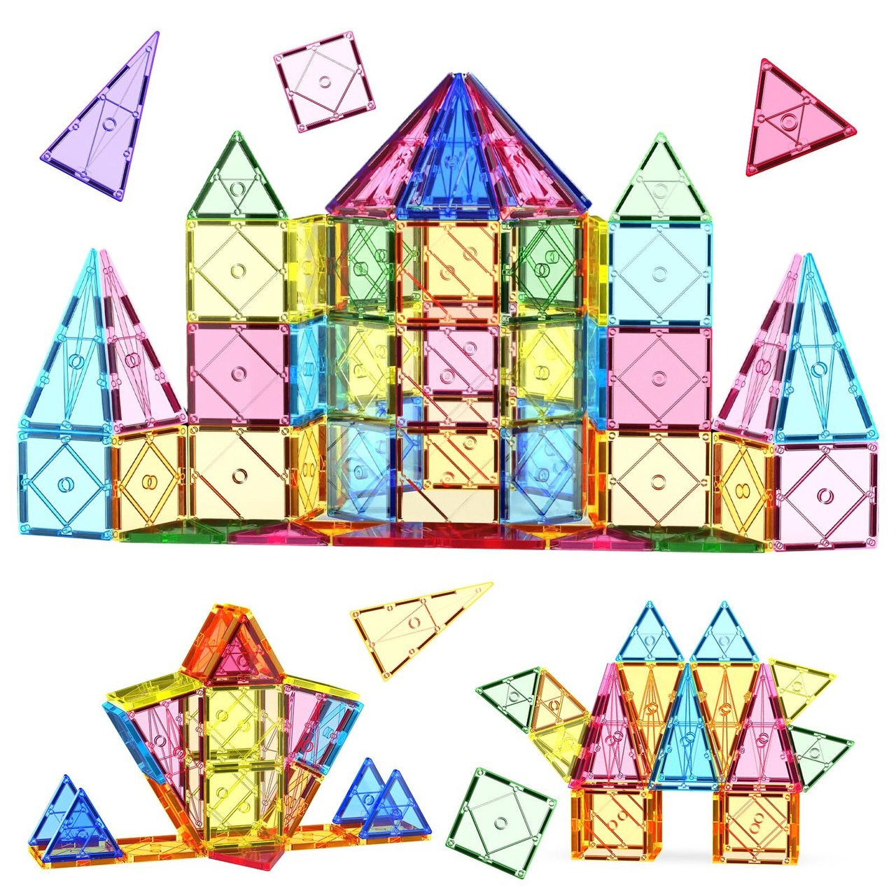 【 たっぷり82ピース・純粋な基本セット】お子様の創造力を刺激する最も基本的な3形状、合計82ピースの大容量セットです。内訳:【正方形×34】、【正三角形×38】、【長三角形×10】。このセットだけでお城やタワー、ロケットなど多様な作品が作れ、初めての導入セットとして、または既にお持ちのセットへの「買い足し」としても最適です。分かりやすい日本語説明書と便利な収納袋(青色)も付属。