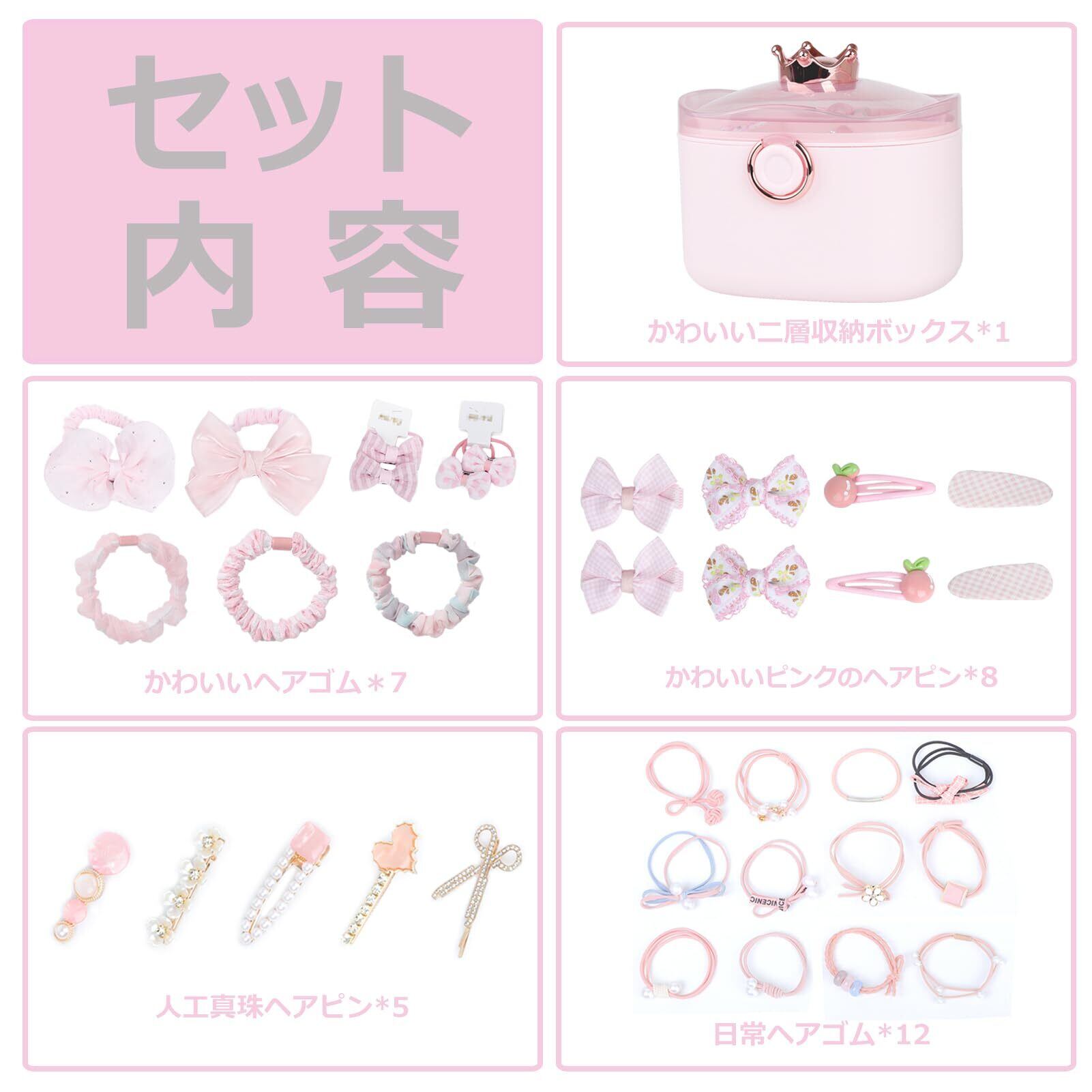 ヘアアクセサリーセット かわいい クラウン収納ボックス付き 2層 女の子プレゼント 大容量 プリンセス アクセサリーセット ヘアクリップ ヘアゴム 入園式 入学式 卒業式 子供の日 七五三 誕生日 クリスマス 女の子ギフト お姫様 小学生 プレゼント (ピンク)