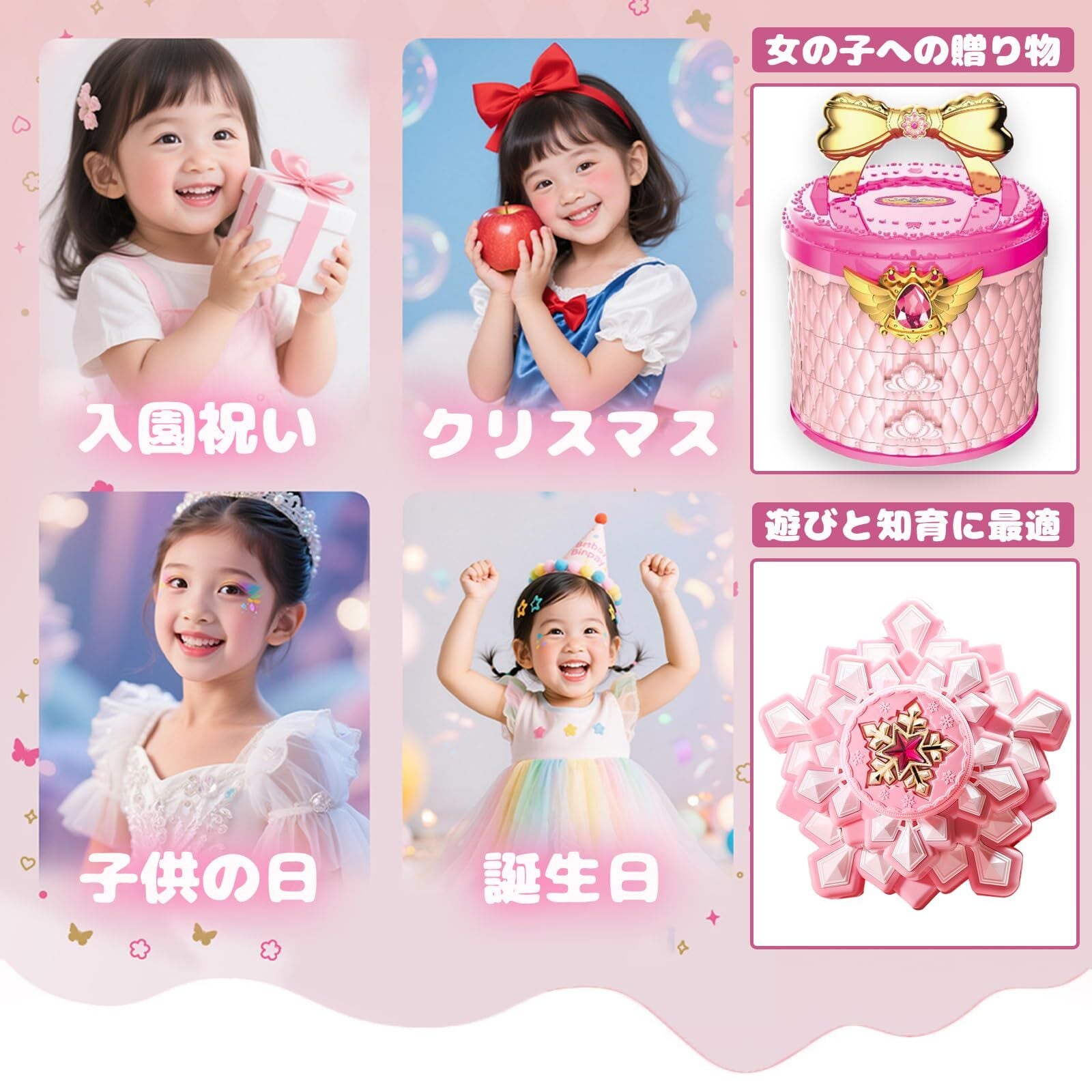 このメイクセットは、誕生日やクリスマスなど特別なお祝いごとにぴったりのギフトです。お子様がなりたい自分を思い描きながら、メイクの楽しさを体験することができます。家族や友達と一緒にメイクアップパーティーを楽しめば、さらに素敵な思い出となることでしょう!