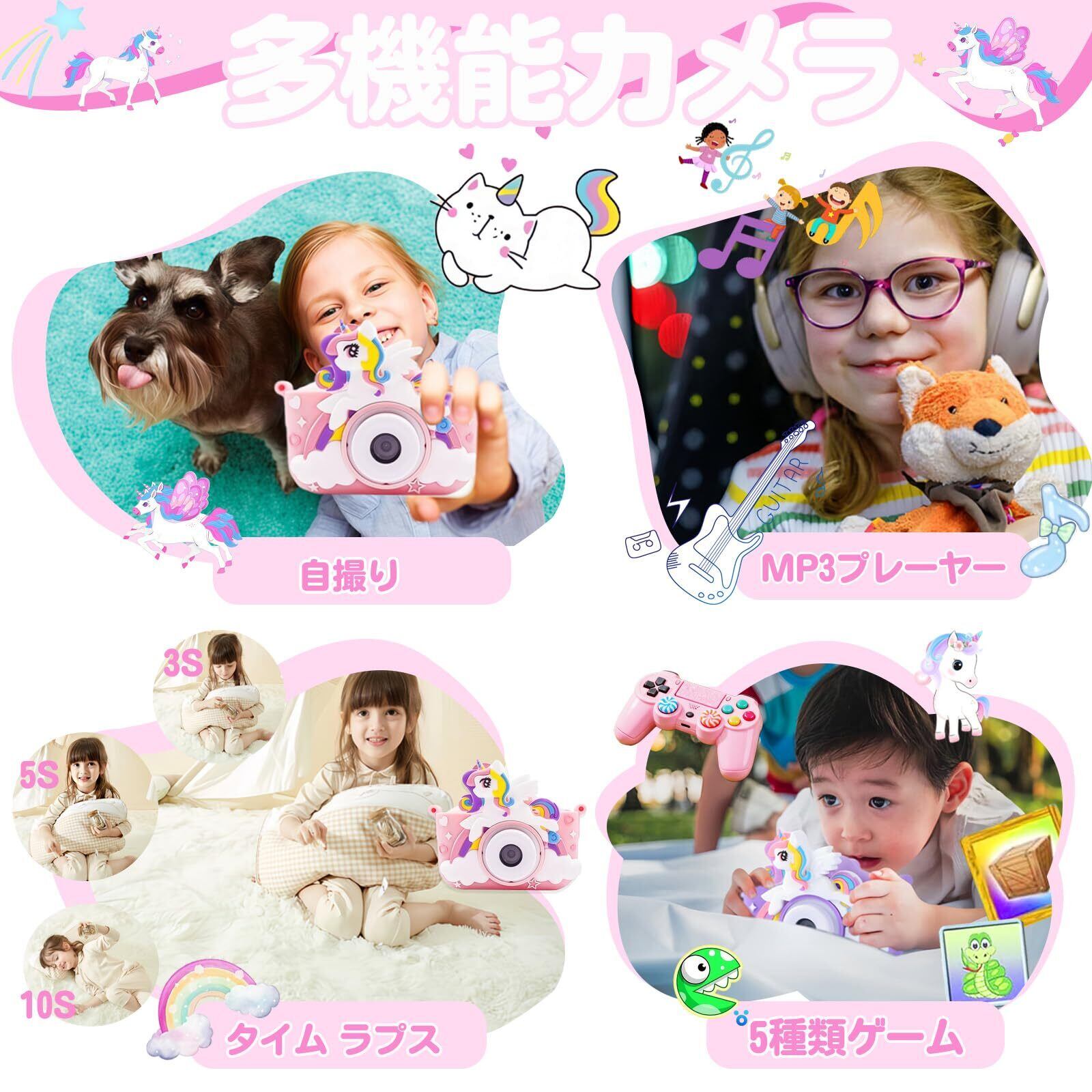 キッズカメラ 子供用 カメラ トイカメラ 子ども用デジタルカメラ 1080P HD 動画 64GB SDカード 4800万画素 タイマー 自撮り Type-C充電 撮影 2.0インチIPS画面 8倍ズーム 5種類ゲーム ユニコーン保護ケース 女の子 男の子 おもちゃ 3~12歳 クリスマス 誕生日 プレゼント ギフト 子供の日 日本語説明書【ピンク】