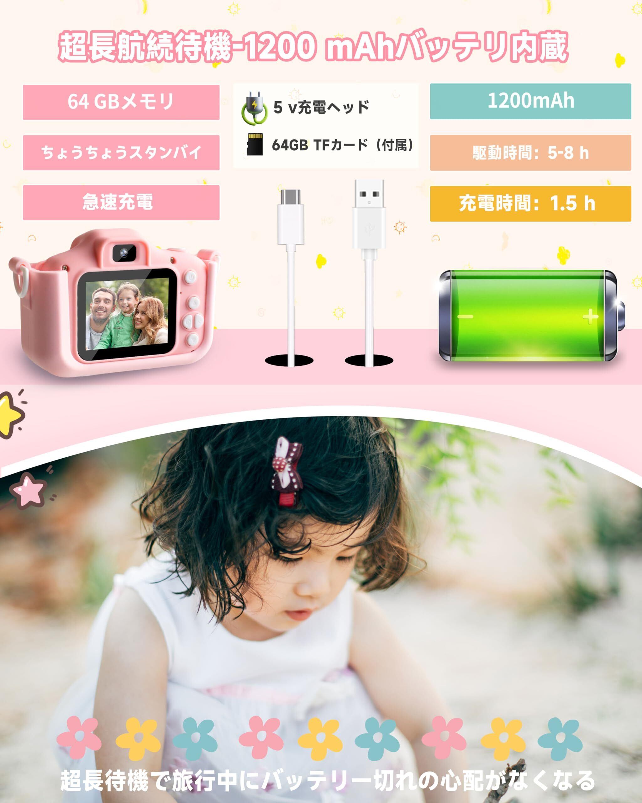 【64GBメモリーカード & USB充電】 このカメラには64GBのメモリーカードが内蔵されており、お子様はすぐに撮影を始めることができます。大量の写真や動画を保存可能です。大容量のリチウムバッテリーを搭載しており、フル充電で約3時間の使用が可能です。また、USB充電に対応しており、家でも外出先でも簡単に充電できます。撮影や再生がいつでもでき、貴重な瞬間を手軽にシェアすることができます。