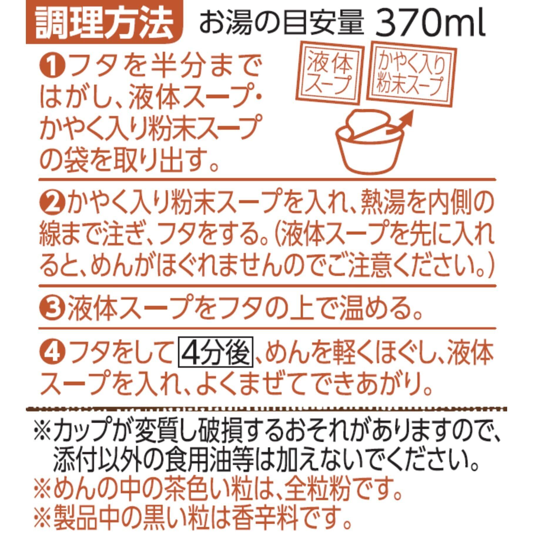 【1】フタを半分まではがし、液体スープ・かやく入り粉末スープの袋を取り出す。【2】かやく入り粉末スープを入れ、熱湯を内側の線まで注ぎ、フタをする。(液体スープを先に入れると、めんがほぐれませんのでご注意ください。)【3】液体スープをフタの上で温める。【4】フタをして4分後、めんを軽くほぐし、液体スープを入れ、よくまぜてできあがり。