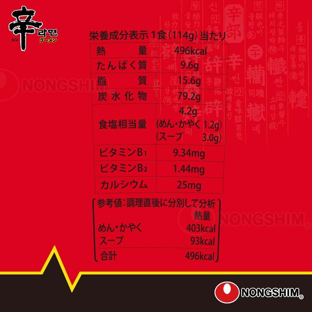 原材料名:油揚げめん(小麦粉、でん粉、植物油脂、食塩、調味酵母エキス)、スープ(香味調味料、唐辛子調味パウダー、糖類、食塩、野菜エキス、調味醤油粉末、しいたけパウダー、酵母調味パウダー、胡椒、粉末みそ、でん粉)、かやく(味付大豆蛋白、ねぎ、しいたけ、にんじん、チンゲンサイ、唐辛子フレーク)/加工でん粉、調味料(アミノ酸等)、かんすい、乳化剤、香辛料抽出物、増粘剤(アラビアガム)、酸化防止剤(ビタミンE、緑茶抽出物)、ビタミンB1、酸味料、ナイアシン、鉄、ビタミンB2、葉酸、(一部に小麦ᆞ大豆を含む)