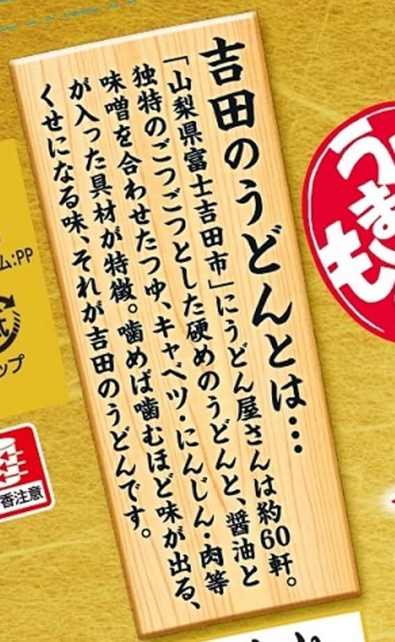 山梨県富士吉田市の名物である“吉田のうどん”をカップ麺で再現しました。ごつごつした硬めの太麺に、醤油と味噌を合わせたつゆ、キャベツ・にんじん・豚肉等の具材が特徴です。吉田うどんの田舎風の素朴な味を再現した、かつおだしが利いた味噌感の強い醤油味。七味唐辛子を使用し味を引き締めました。キャベツ、にんじん、ねぎ、味付豚肉、オニオン揚玉。※吉田うどんとは・・・山梨県富士吉田市にうどん屋さんは約60軒。独特のごつごつとした硬めの太麺と、醤油と味噌を合わせたつゆ、キャベツ・にんじん・豚肉等が入った具材が特徴。噛めば噛むほど味が出る、くせになる味、それが“吉田のうどんです”