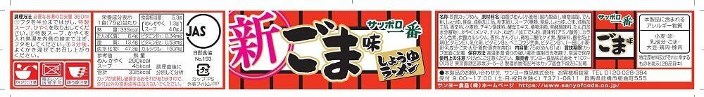 原材料名:油揚げめん(小麦粉(国内製造)、植物油脂、でん粉、しょうゆ、食塩、油脂加工品、粉末卵)、スープ(糖類、食塩、しょうゆ、ごま、油脂加工品、香辛料、小麦粉、チキン調味料、酵母エキス、植物油脂、発酵調味料、たん白加水分解物)、かやく(メンマ、ナルト、ねぎ)/加工でん粉、調味料(アミノ酸等)、カラメル色素、炭酸カルシウム、香料、かんすい、微粒二酸化ケイ素、酸味料、酸化防止剤(ビタミンE)、乳化剤、ビタミンB2、ベニコウジ色素、ビタミンB1、(一部に小麦・卵・乳成分・ごま・大豆・鶏肉・豚肉を含む)