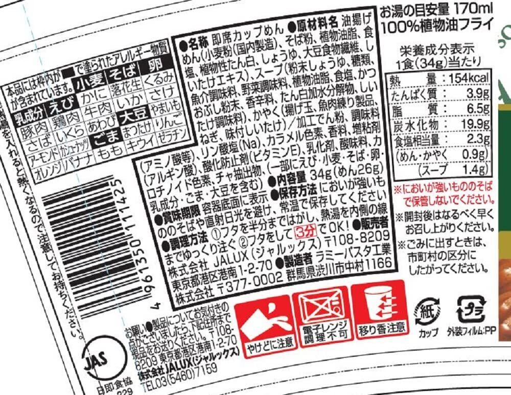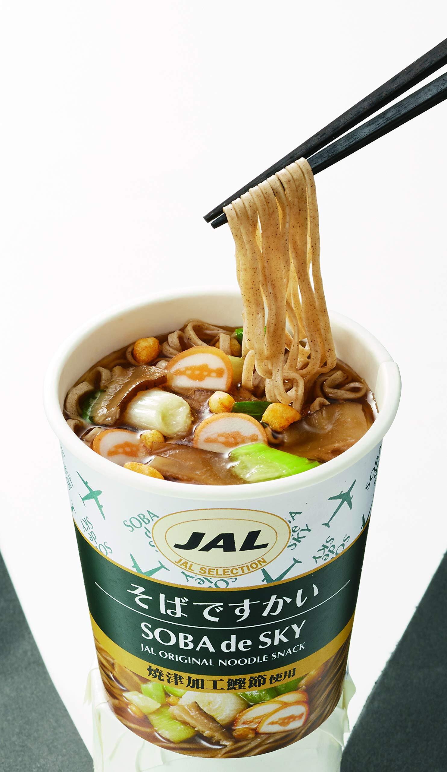 麺:気圧の関係でお湯の沸点が80~85度となる飛行中の航空機内にて使用することを目的に戻りやすく、のびにくい特性の麺を開発、使用しています。その為、ポットのお湯でも再沸騰しなくても大丈夫。注いで3分で出来上がる。100%植物油を使用したフライ麺です。 スープ:焼津加工鰹節といりこを使用した風味豊かなしょうゆ味にほのかな柚子の爽やかさを加えました。 具材:大きいネギに天かす、さらには飛行機の絵柄のかわいらしいオリジナルかまぼこが入っておりますので、見た目も楽しんでいただけます。合成保存料、着色料とも一切使用しておりません。 パッケージ:JAL国際線の副食として召し上がっていただくことから、“飛行機"の絵柄で、空のイメージが感じられるかわいらしいパッケージデザイン。おやつや夜食、ランチに添えて、ちょうど良いコンパクトサイズになっています。