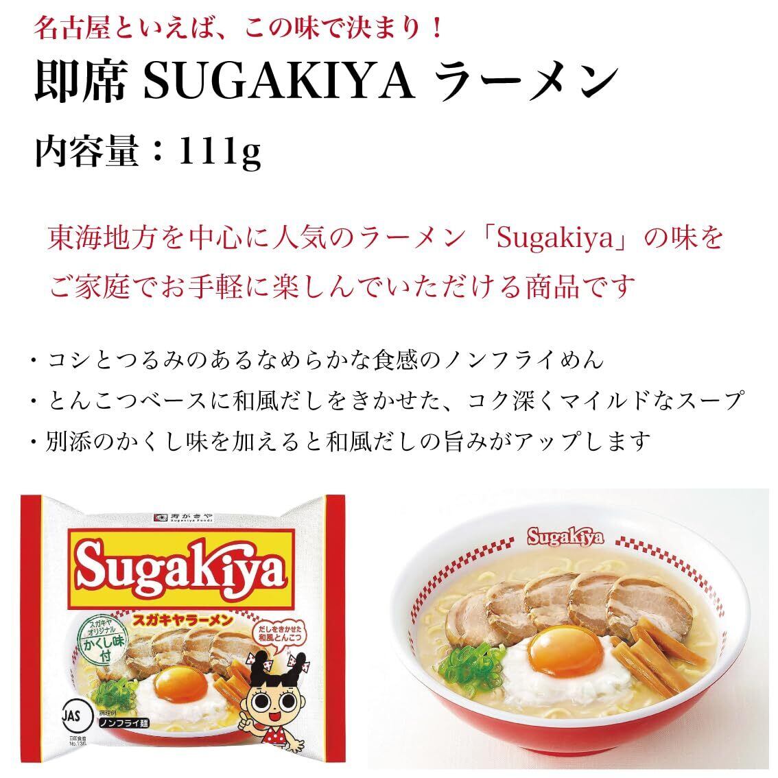 名古屋の味 だしをきかせた和風とんこつ 平成9年の発売以来ご好評いただいている「即席SUGAKIYAラーメン」。 東海地方を中心に人気のラーメンチェーン「Sugakiya」の味をご家庭でお手軽に楽しんでいただける商品です。