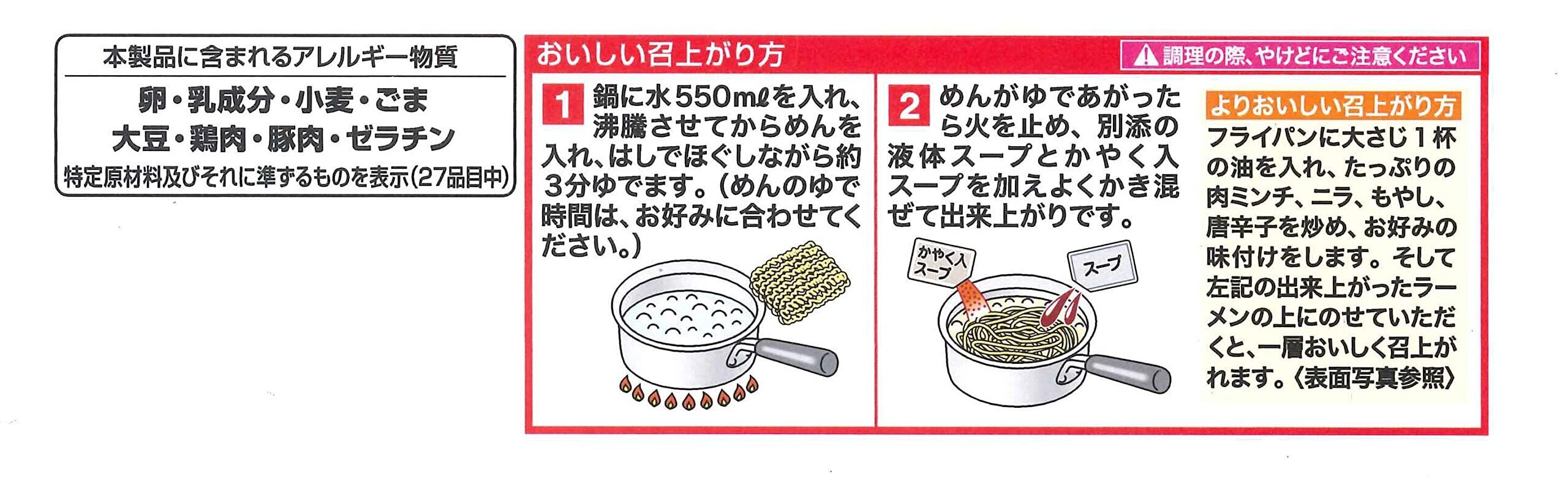 原材料:めん(小麦粉、小麦たん白、食塩、植物油脂、卵白、たん白加水分解物)、スープ(しょうゆ、動植物油脂、食塩、チキンエキス、豆板醤、ポークエキス、砂糖、香辛料、唐辛子、野菜エキス、たん白加水分解物、ゼラチン)、かやく(唐辛子、にら)、加工デンプン、調味料(アミノ酸等)、着色料(カラメル、クチナシ、パプリカ色素)、増粘剤(加工デンプン、増粘多糖類)、かんすい、酸化防止剤(V.E、V.C)、乳化剤、二酸化ケイ素、香辛料抽出物、香料、(原材料の一部に乳成分、ごまを含む)