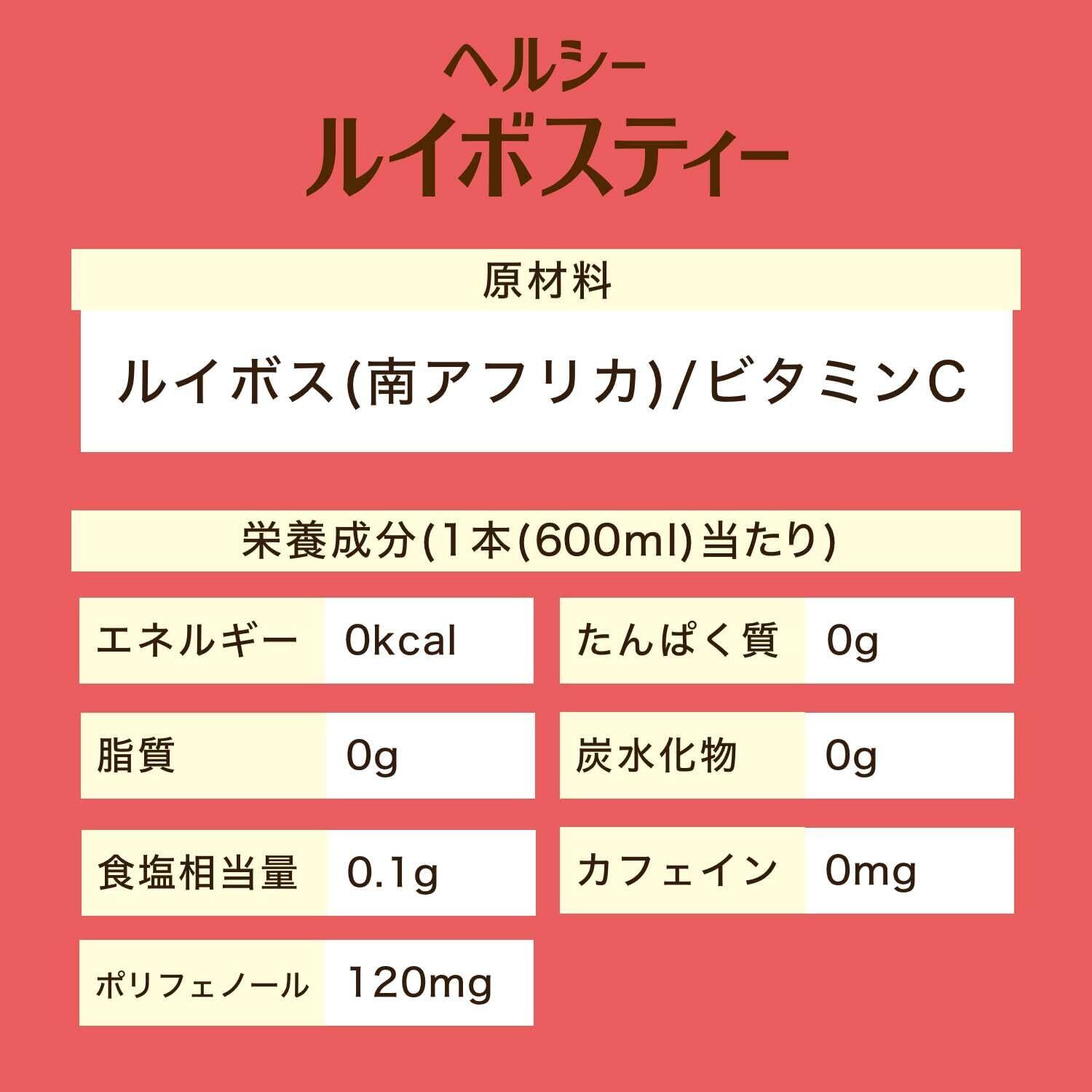 栄養成分(1本(600ml)当たり):エネルギー:0kcal、たんぱく質:0g、脂質:0g、炭水化物:0g、食塩相当量:0.1g、カフェイン:0mg、ポリフェノール:120mg