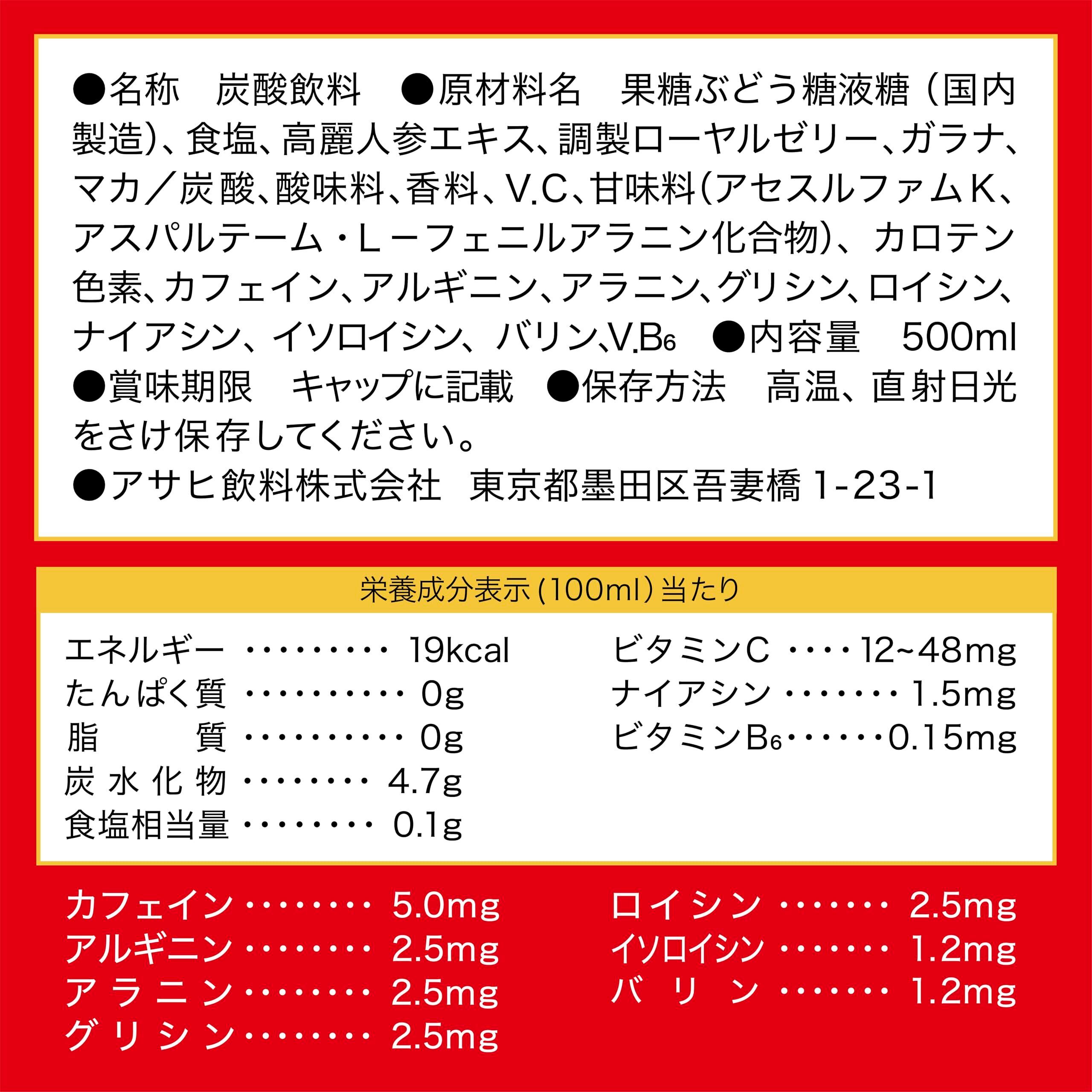 果糖ぶどう糖液糖(国内製造)、食塩、高麗人参エキス、調製ローヤルゼリー、ガラナ、マカ/炭酸、酸味料、香料、V.C、甘味料(アセスルファムK、アスパルテーム・L-フェニルアラニン化合物)、カロテン色素、カフェイン、アルギニン、アラニン、グリシン、ロイシン、ナイアシン、イソロイシン、バリン、V.B6