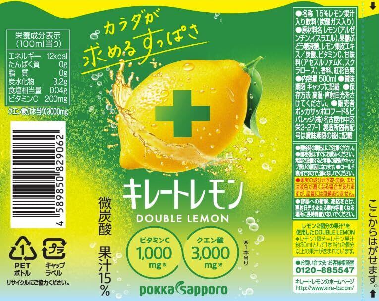 キレートレモン Wレモン 500ml×24本 クエン酸 ビタミンC レモン果汁 炭酸飲料 ペットボトル ポッカサッポロ