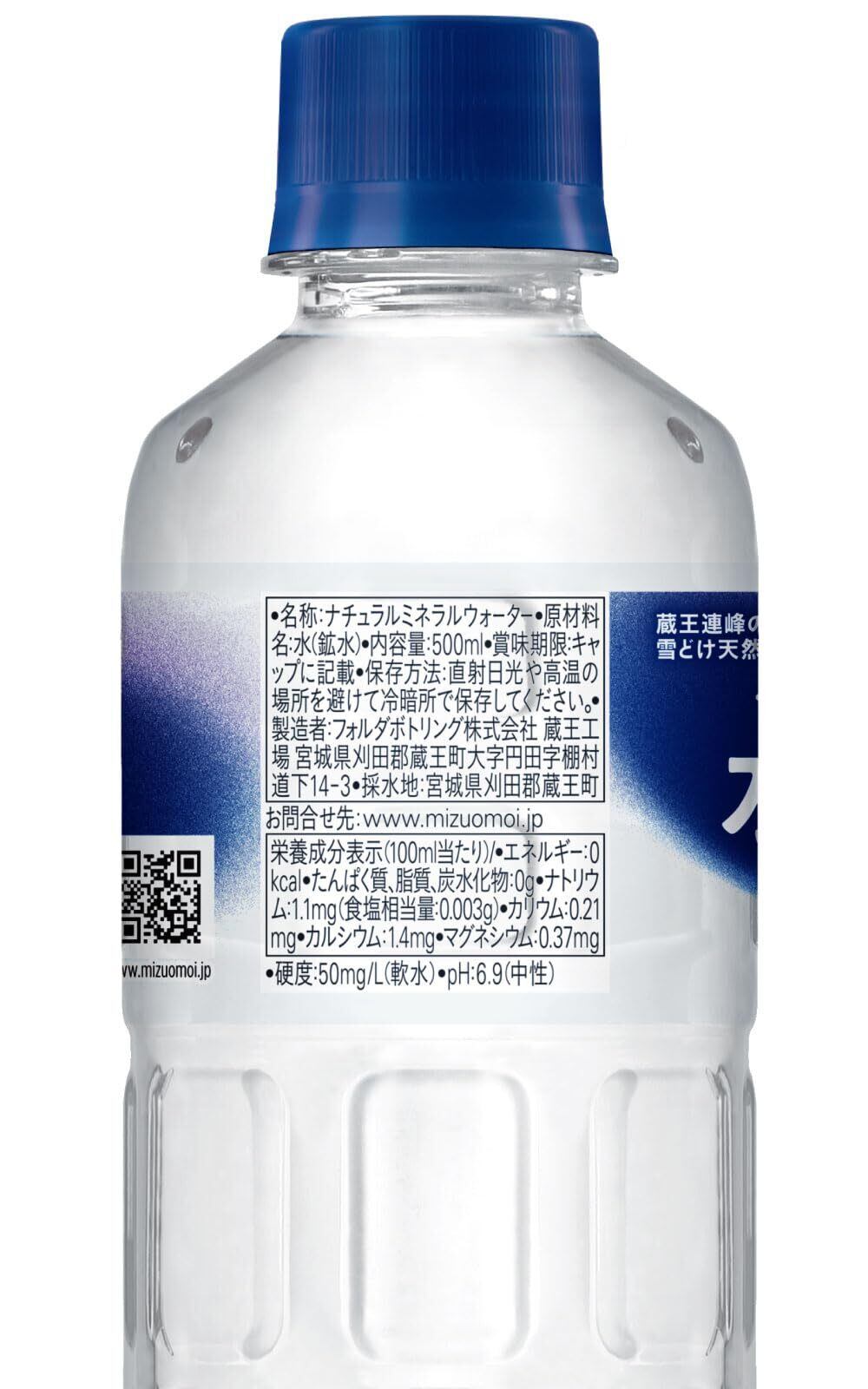 栄養成分表示(100ml当たり): エネルギー0kcal、たんぱく質、脂質、炭水化物0g、ナトリウム1.1mg(食塩相当量:0.003g)、カリウム0.21mg、カルシウム1.4mg、マグネシウム0.37mg