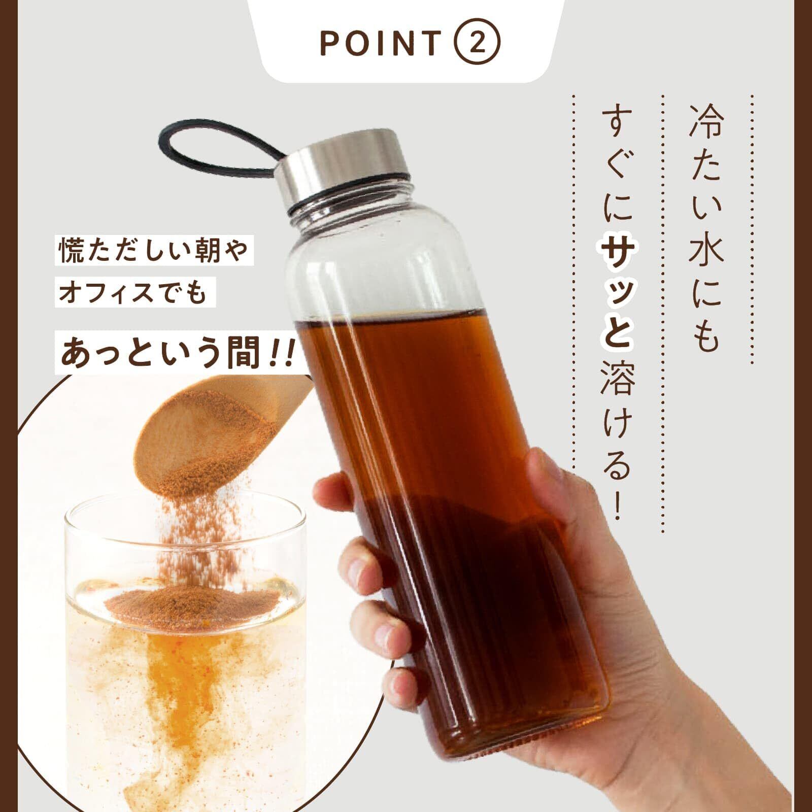 【冷たい水にもサッと溶ける】お湯はもちろん、冷たい水でもサッとすぐに溶けるので、朝の支度や仕事の合間など、忙しいときにも手間なくかんたんにお茶が作れます。