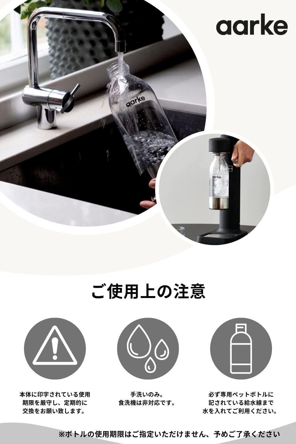 【商品仕様】最大容量450ml、メモリの線まで水を入れてお使いください。冷水以外はご利用になれません。※推奨:冷水(4-6℃)最大40 ℃未満。必ず専用ペットボトルに記されている給水線(目盛線)まで水を入れてご利用ください。 目盛線を守らない場合、水が本体の中に入ってしまうことがあり、時間が経つにつれて破損する可能性があります。ジュースやワイン、牛乳などは絶対に炭酸化しないでください。 その他、専用ボトルには果物、野菜、ハーブ、フレーバー系の化合物やシロップを入れないでください。また、気の抜けた古いソーダ水の再炭酸化はしないでください。※専用ペットボトルを冷凍庫には入れないでください。※バクテリアの繁殖や悪臭がしないよう、専用ペットボトルは常に清潔な状態で保管してください。※他社の炭酸水メーカーに、AARKEのボトルを絶対に使用しないでください。※AARKE以外の他社メーカーのボトルはご利用になれません。強引に装着する行為は故障や事故の原因になります。