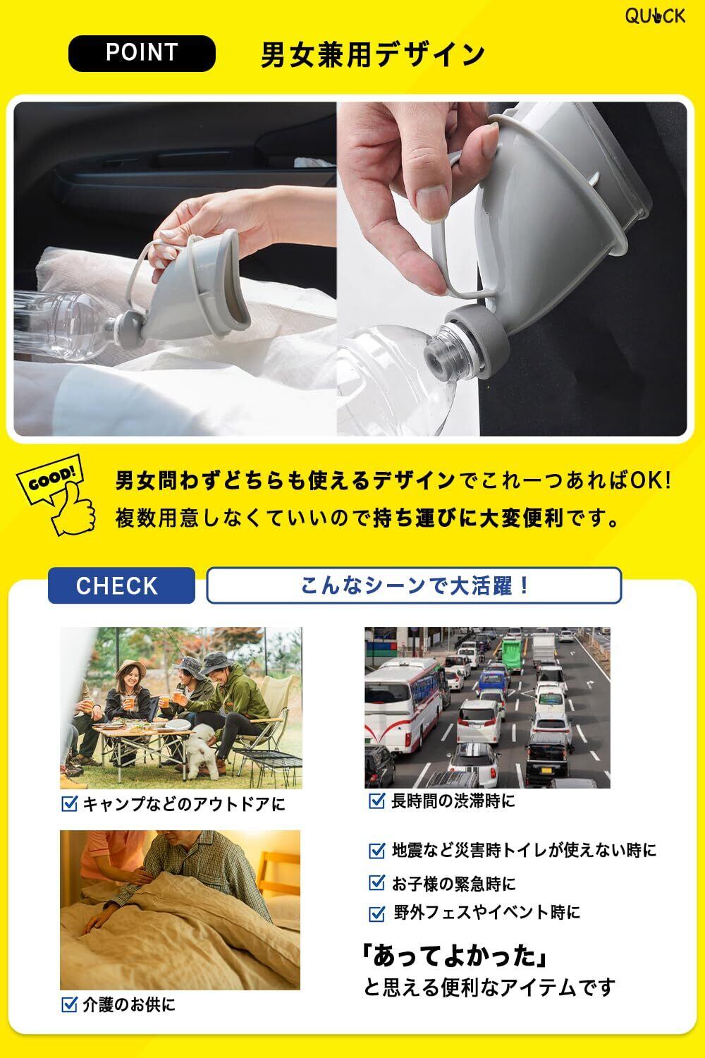 【 こんなシーンにも 】 災害時にはもちろん、ドライブ中の長時間の渋滞や車中泊、キャンプなどのアウトドアなどにもご使用いただけます。コンパクトで軽量なので持ち運びに便利です。また、夜間の急なトイレに高齢者やご病気の方の介護としても大変便利なアイテムとなっております。