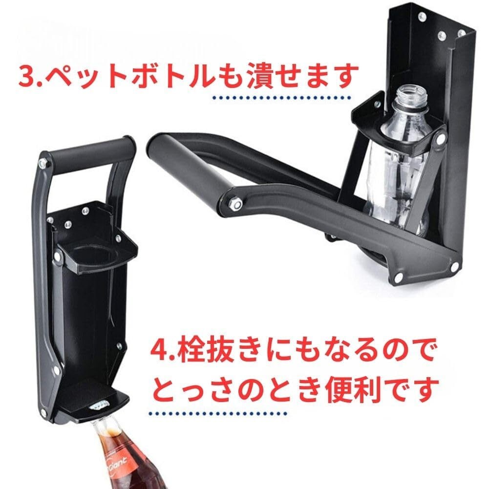 【適用範囲】缶クラッシャーの高レバー設計により、缶のリサイクルがより容易、迅速、かつ安全に行われます。また 底には滑り止めがついているので缶をより安定させることができます。500mlまでのアルミ缶に適しています。 押し板部分に穴が開けられているからペットボトルもセットして潰すことができるペットボトル潰し機にもなります。※説明書は付属しません。