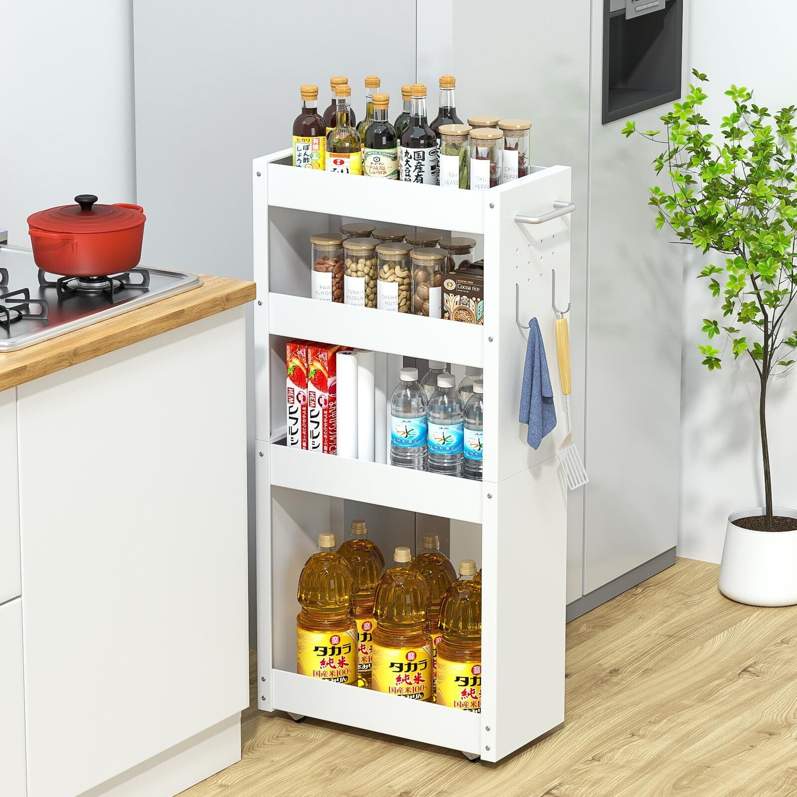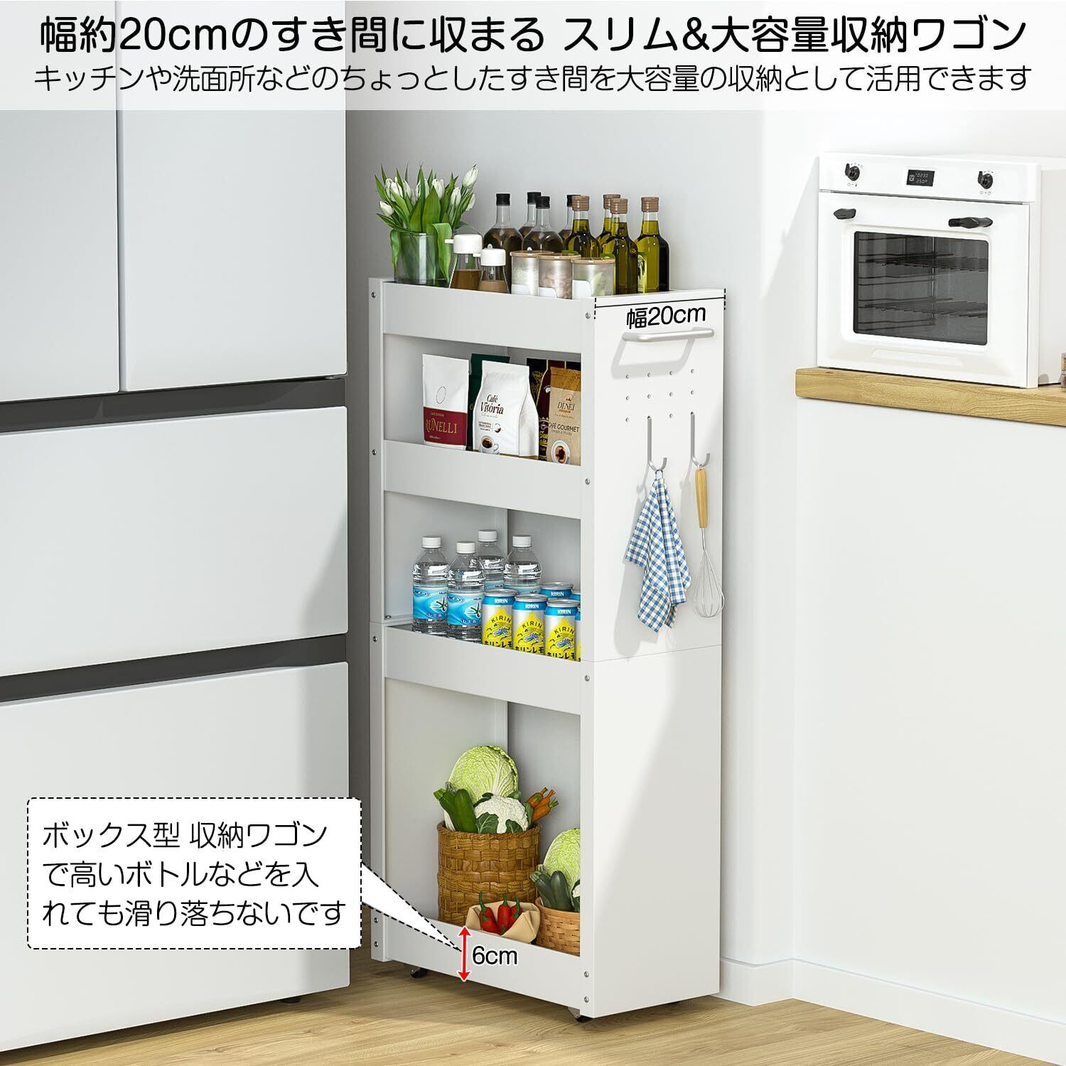 PRTONE 隙間収納 キッチンワゴン スリム キャスター付き スリムラック 洗面所 収納ラック 冷蔵庫横 スリムワゴン 4段 隙間ラック 細い棚 ペットボトルラック 調味料棚 取っ手付き (ホワイト, 約幅20*奥行き41*高さ85cm)