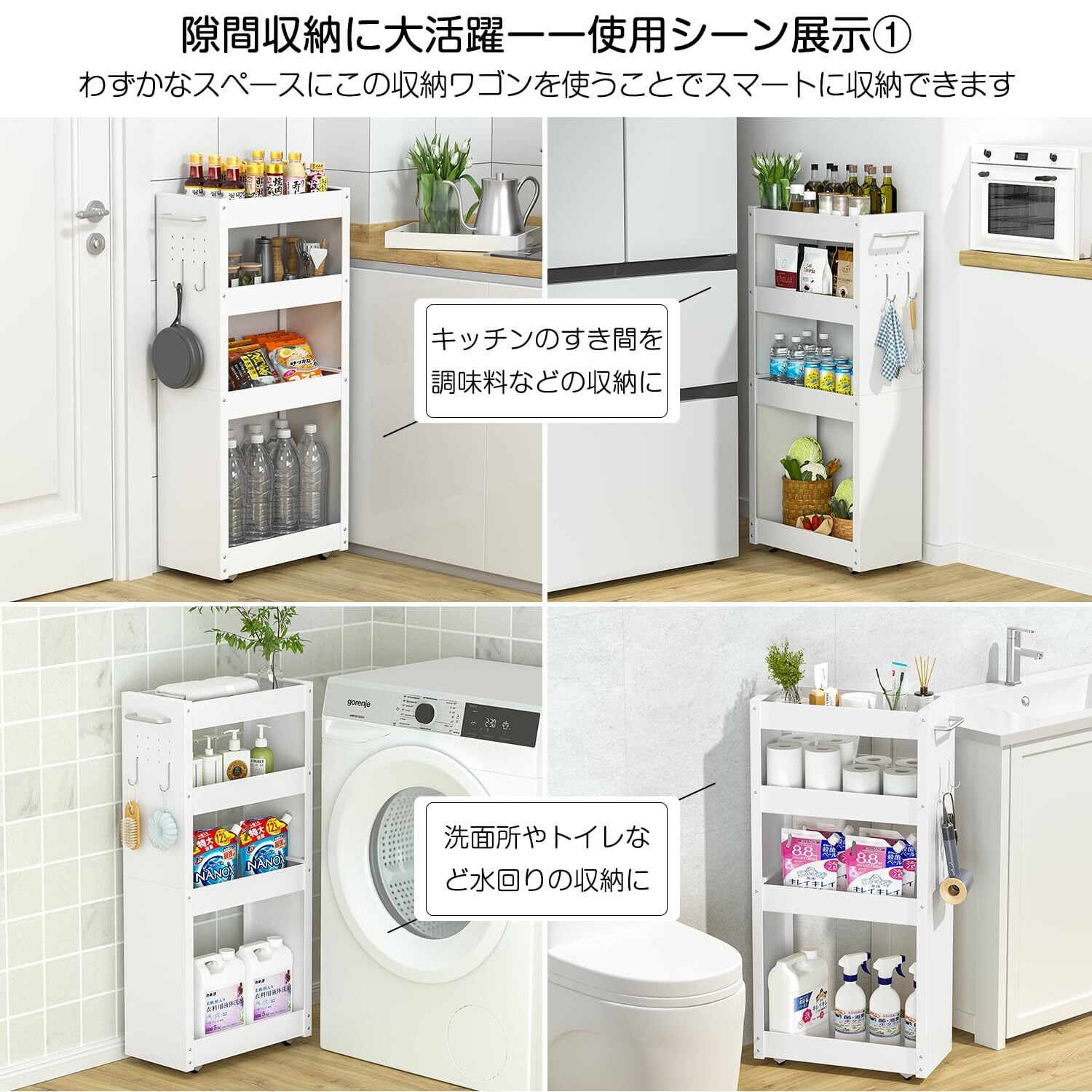 【隙間収納に大活躍】細身設計でキッチン、洗面所、クローゼット、美容室などさまざまな場所の隙間に適用している隙間ラックです。スリム キッチンワゴンとしてや、冷蔵庫横の隙間や洗濯機横などの家のちょっとしたスペースでの使用に最適で、調味料、洗剤、バスルーム用品などを楽に収納可能です。狭い空間を有効利用したい人にぜひおすすめです。また、ボックス型 スリムスチールワゴンで子供のおもちゃなどのものを立ってて収納にもピッタリです。