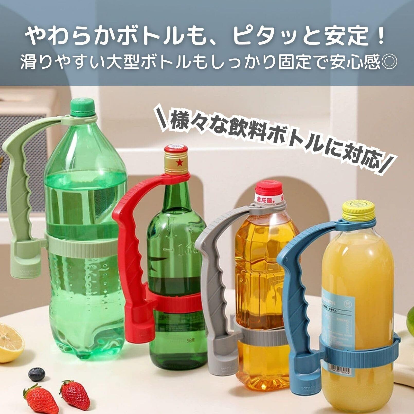 【握りやすい人間工学設計で快適な使用感】 このペットボトル用ハンドルは、人間工学に基づいて設計されており、手にしっかりフィットする滑り止めグリップが特長です。特に高齢者や手に力のない方でも扱いやすく、重い飲料ボトルやオイルボトルも安定して注ぐことができ、日常のキッチン作業をよりスムーズにサポートします。