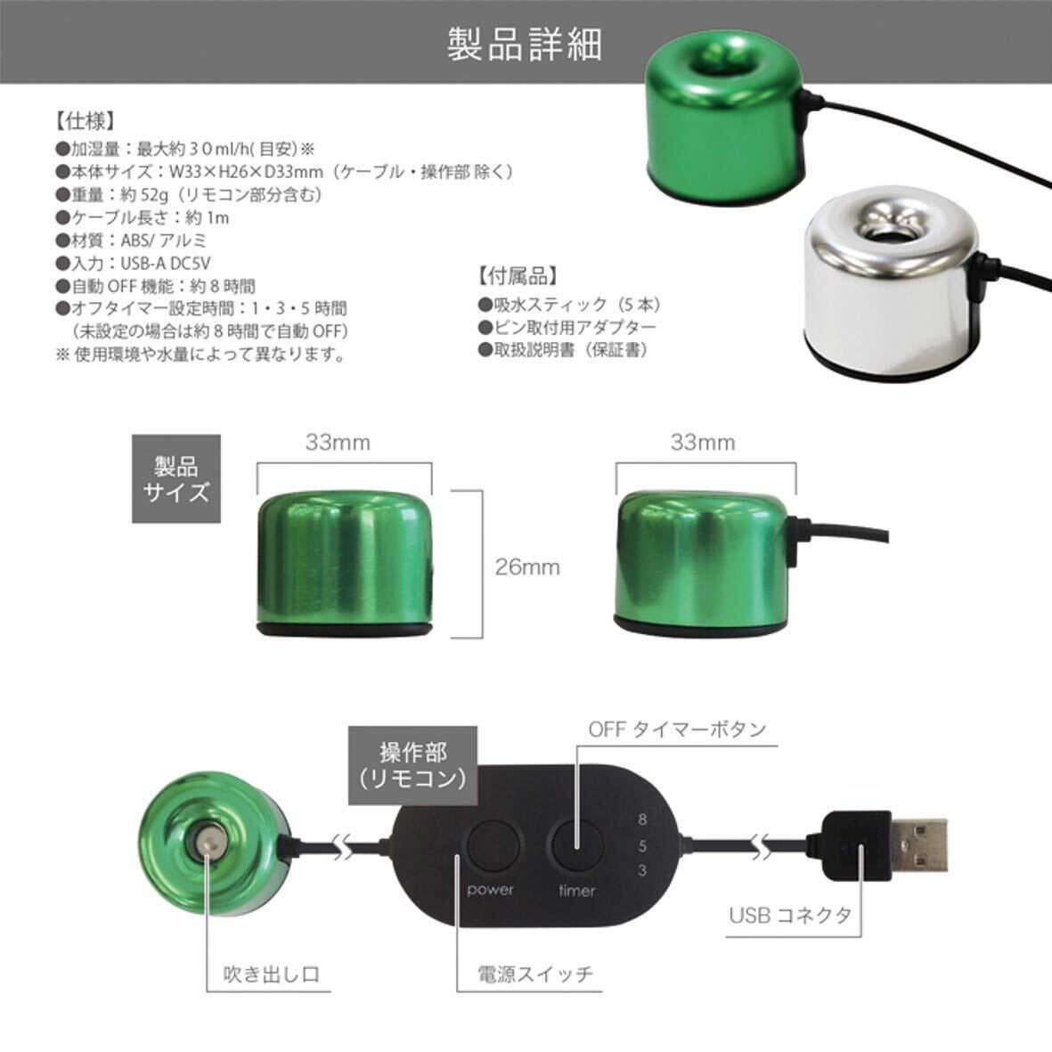 トップランド アルミヘッド 加湿器 Cherry 卓上 USBタイプ (ペットボトル/グラスボトル 対応) オフタイマー機能 リモコン付き メタルグリーン SH-CHY30MG
