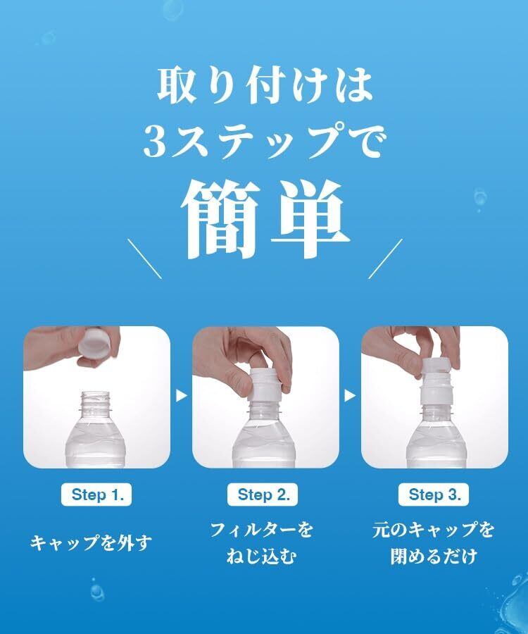 【便利さと経済性】 カートリッジ1個で 最大120L の使用が可能です。1日2Lを目安とした場合、交換時期は 約2ヶ月。外出先では500mlボトル、自宅では2Lボトルに装着するなど、さまざまなシーンで便利にお使いいただけます。