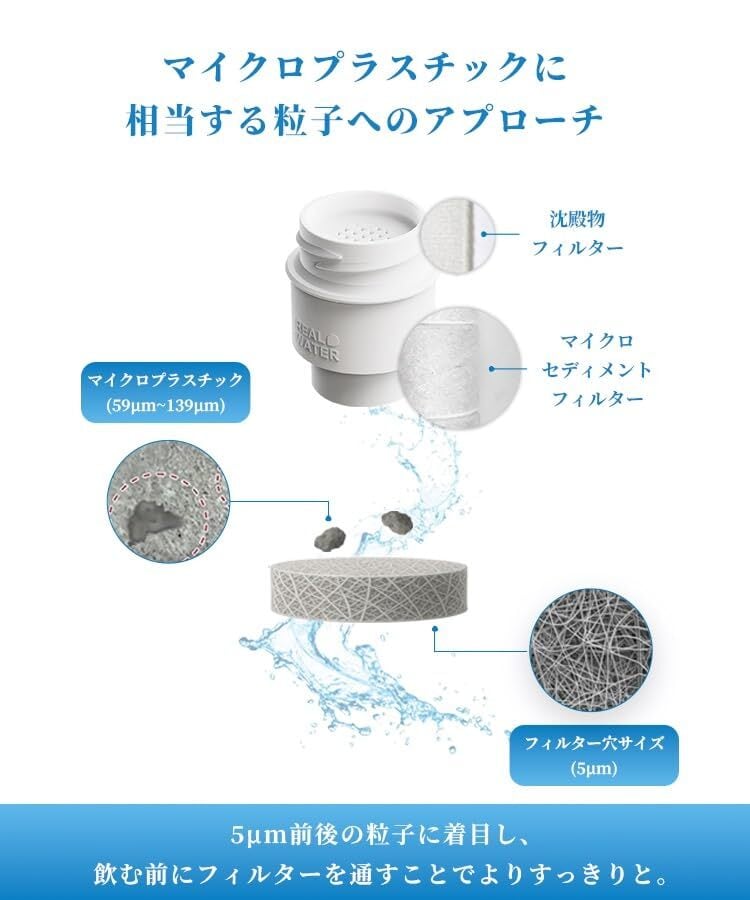 【微細粒子に着目したフィルター】 ミネラルウォーターに含まれるマイクロプラスチック(約59〜139µm)よりも小さい5µm(0.005mm)相当のマイクロフィルター を採用し、飲む前に微細な粒子を通しにくい構造です。