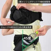 【ワンタッチでいつでも締め直し自在】 ボトルの水分の減り具合や、お腹の張り具合に合わせて、走りながらいつでもフィット感を微調整可能。「少し緩んできた」と感じたら、立ち止まらずにギュッと締め直せるため、ズレ下がりを気にせずゴールまで走り抜けます。
