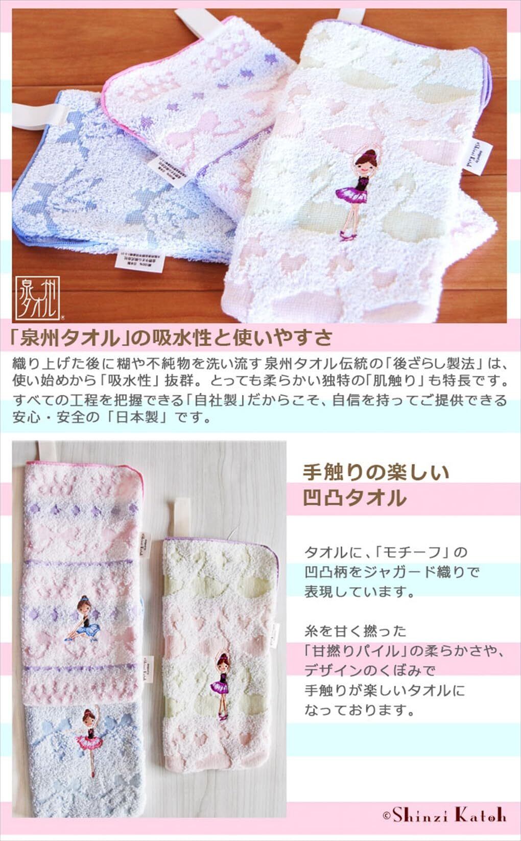 人気雑貨デザイナー「シンジカトウ」が「バレエ」をイメージしてデザインしたイラストを、タオル地にデコボコで表現し、バレリーナをワンポイント刺繍にして施しました。小物柄の背景に、かわいらしいバレリーナの刺繍、パステル調の優しい色づかいのデザインです。自分用はもちろん、ギフトや贈り物にも最適です。
